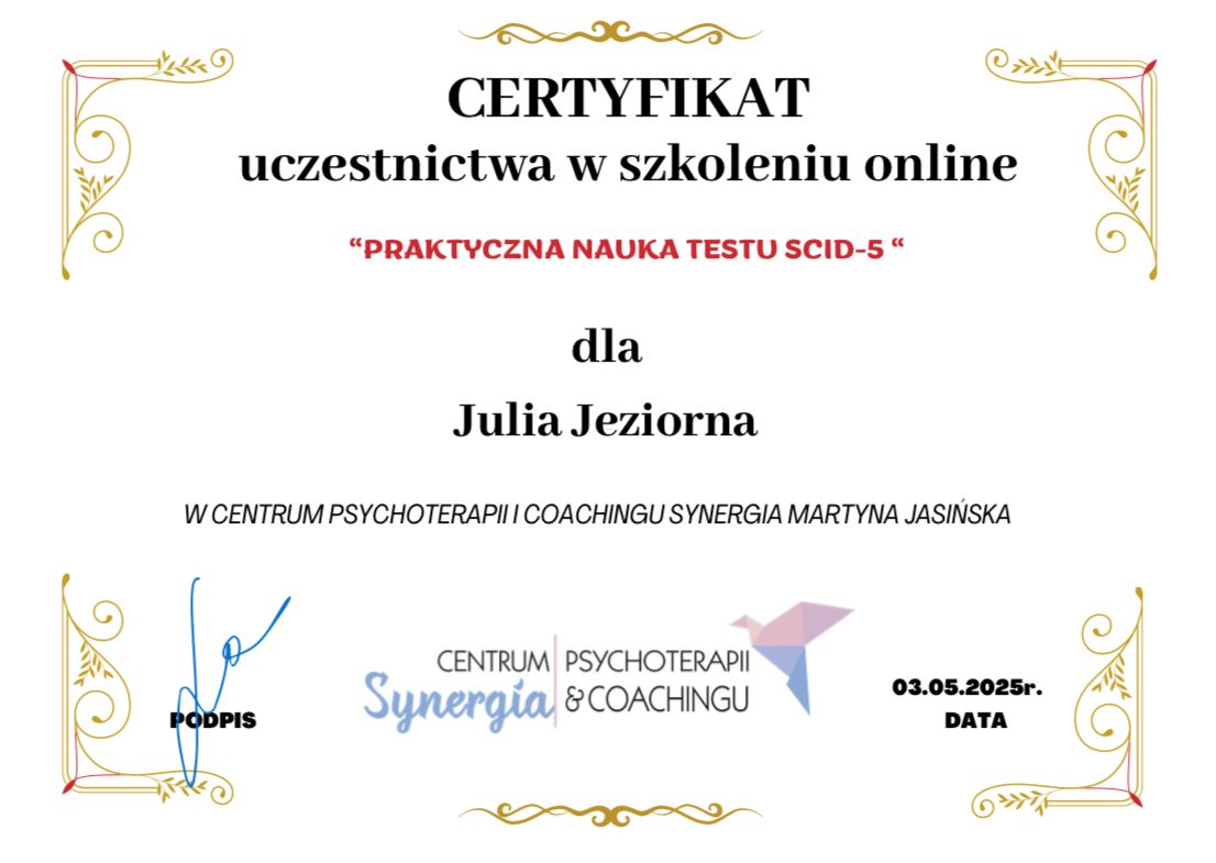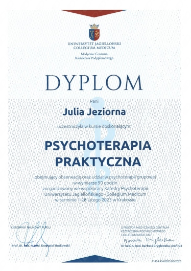 Pani Julia to bardzo empatyczna i ciepła osoba. Na spotkaniach stwarza aurę bezpieczeństwa, w której czuje się komfortowo mówiąc o swoich problemach. Dodatkowo jej trafne uwagi, zmieniły moją perspektywę na to z czym się zmagam.