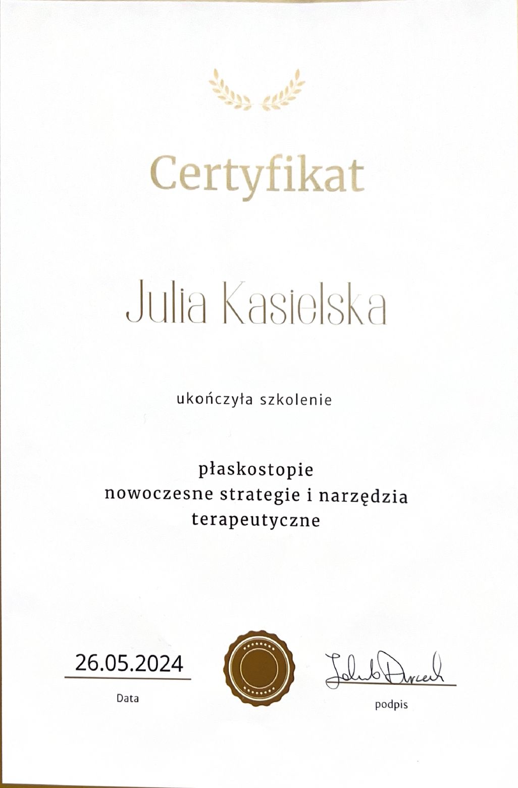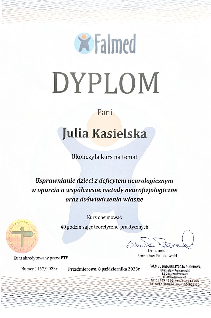 Nazywam się Julia Kasielska. Jestem fizjoterapeutką pediatryczną, która z pasją wspiera rozwój najmłodszych pacjentów i pomaga im pokonywać trudności ruchowe. W swojej pracy łączę rzetelną wiedzę, doświadczenie oraz uważne podejście do dziecka i jego rodziny.
