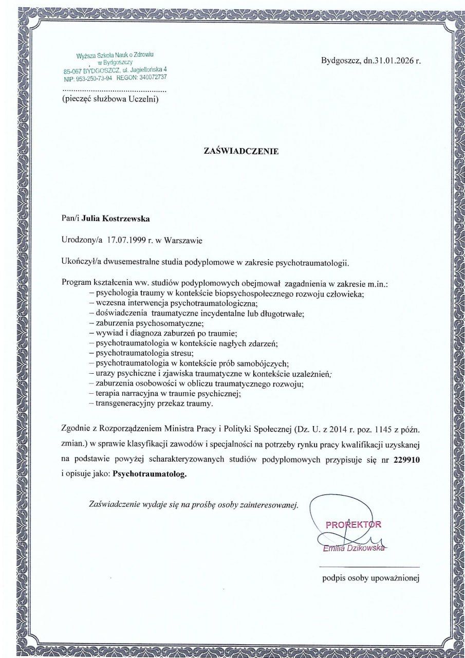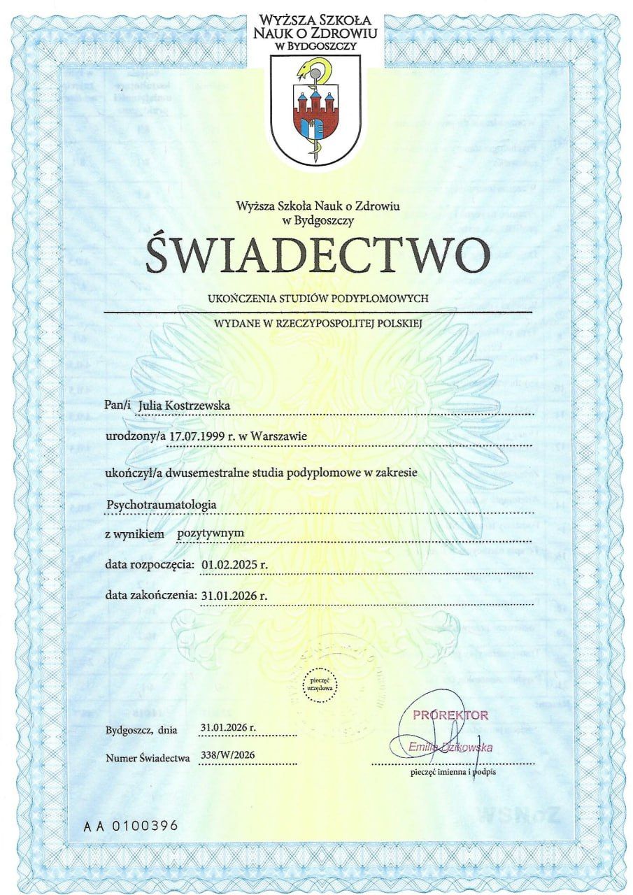 Jestem dyplomowanym psychologiem i psychotraumatologiem w trakcie szkolenia, który z zaangażowaniem wspiera dzieci, młodzież oraz osoby dorosłe w osiąganiu dobrostanu psychicznego i rozwoju osobistego.