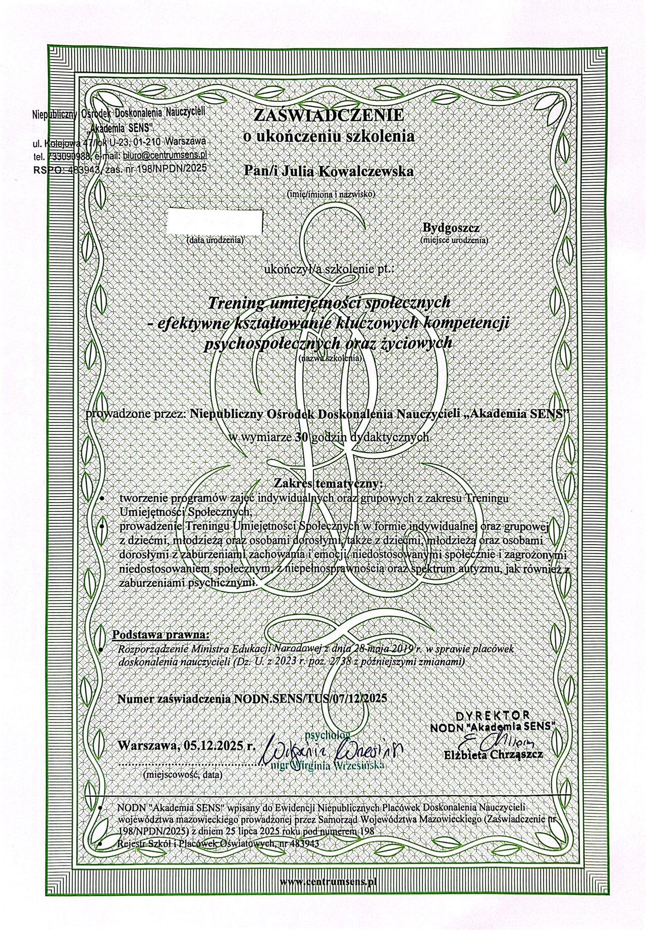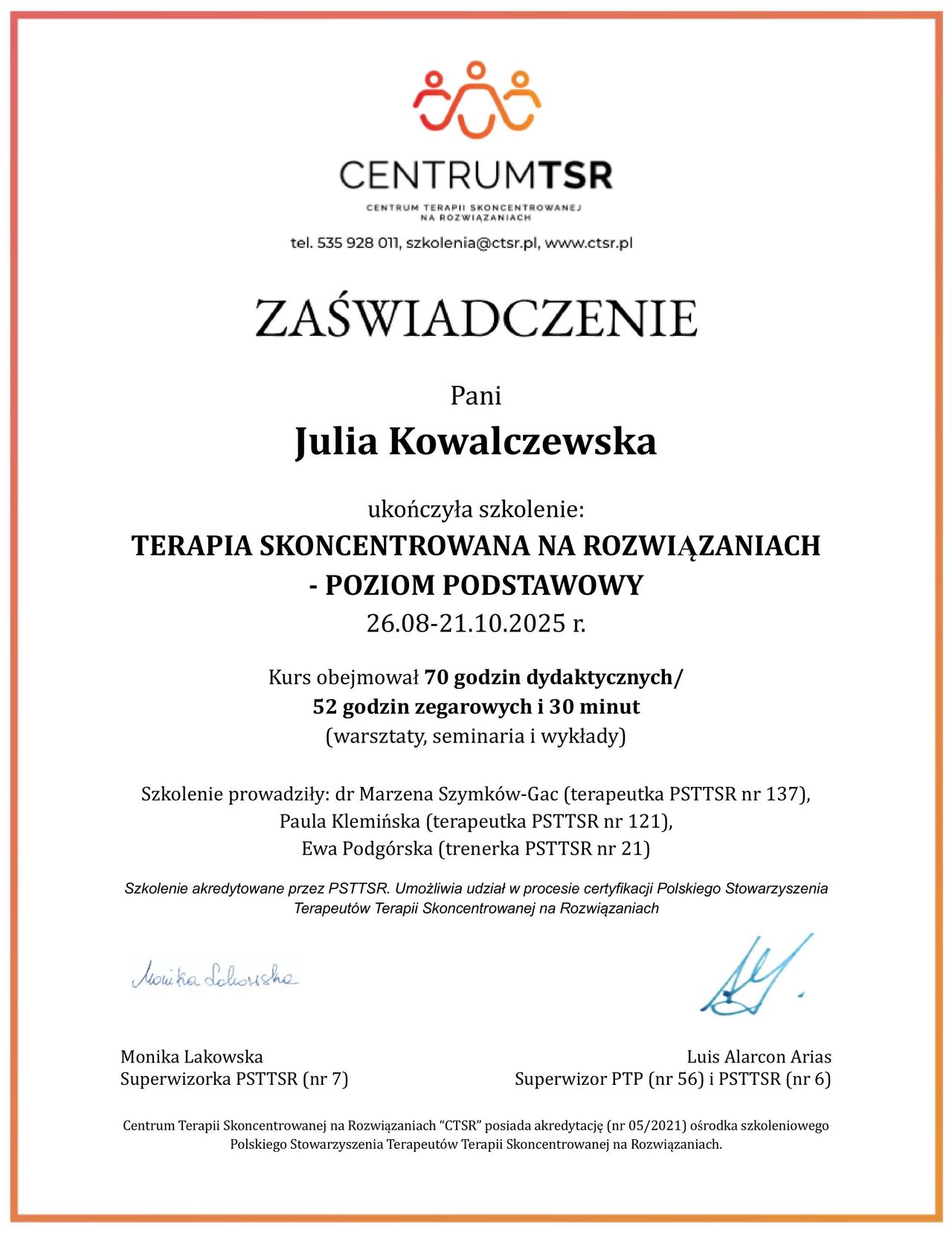 W mojej pracy wykorzystuję elementy Terapii Skoncentrowanej na Rozwiązaniach. Posiadam certyfikat ukończenia I stopnia szkolenia w tym nurcie.