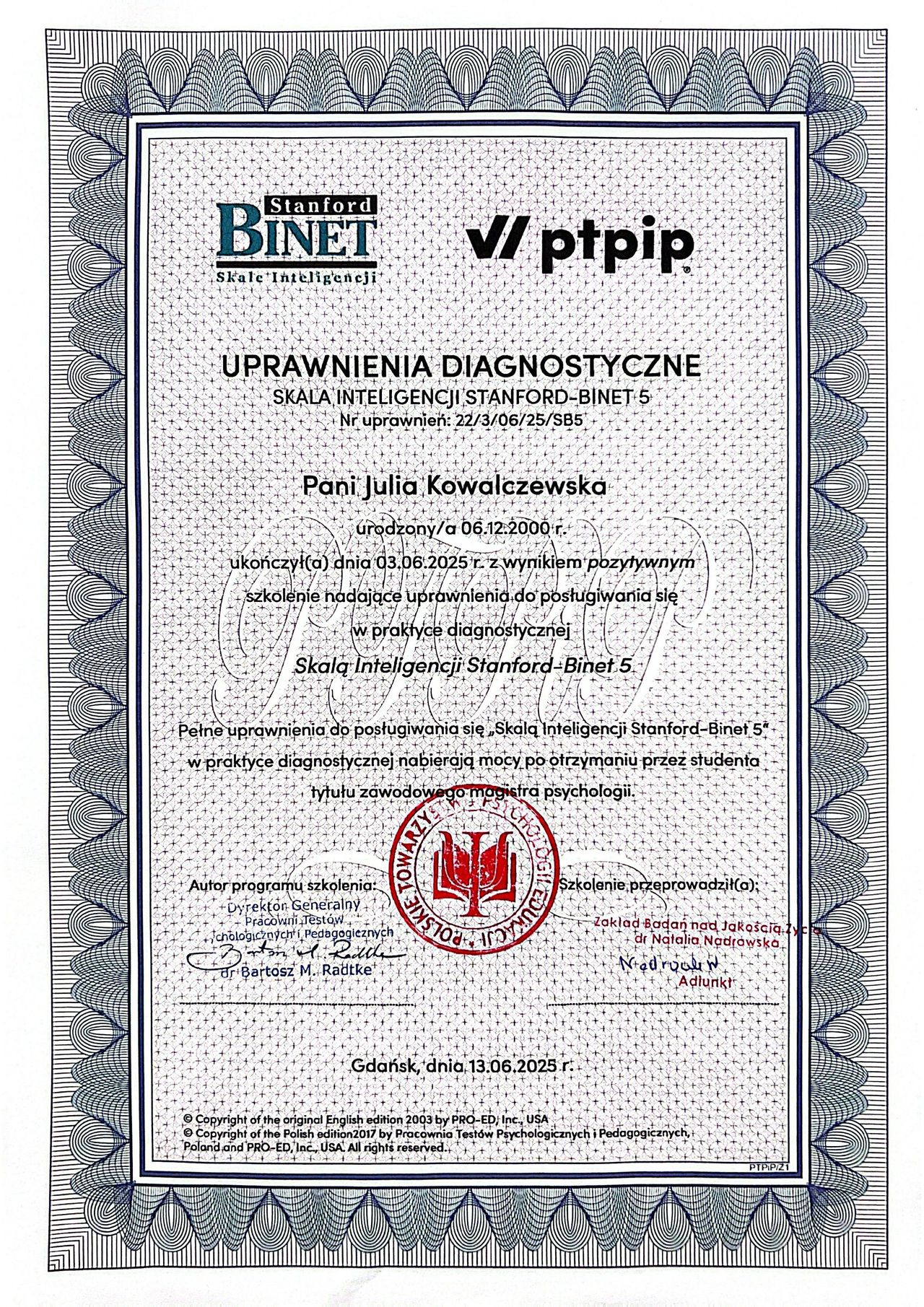 Aby zapewnić najwyższą jakość usług dokształcam biorąc udział w kursach oraz szkoleniach. Korzystam z regularnej superwizji. Jestem członkinią Stowarzyszenia Absolwentów Psychologii po Uczelniach Medycznych.