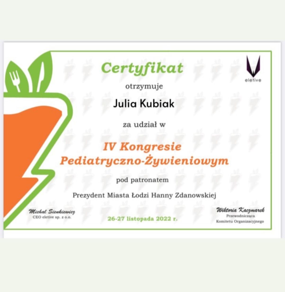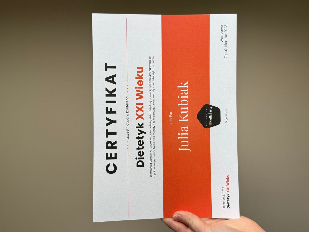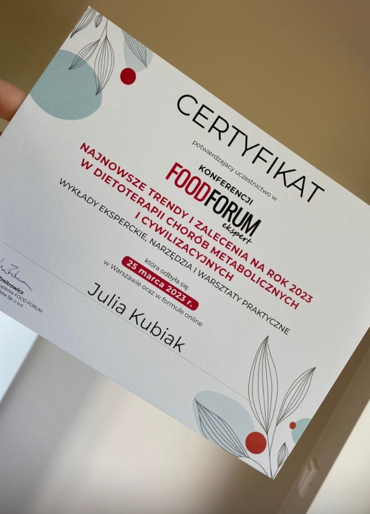Stale poszerzam swoją wiedzę, biorąc udział w kursach i konferencjach, by pracować zgodnie z aktualną wiedzą medyczną i dietetyczną. Uczestniczyłam m.in. w konferencjach dietetycznych DNŻ i Food Forum oraz w szkoleniu „Immunobiom” organizowanym przez Instytut Medycyny Żywienia w Łodzi. Odbyłam również kursy z zakresu obsługi pacjenta dietetycznego oraz interpretacji wyników badań krwi w kontekście dietoterapii.