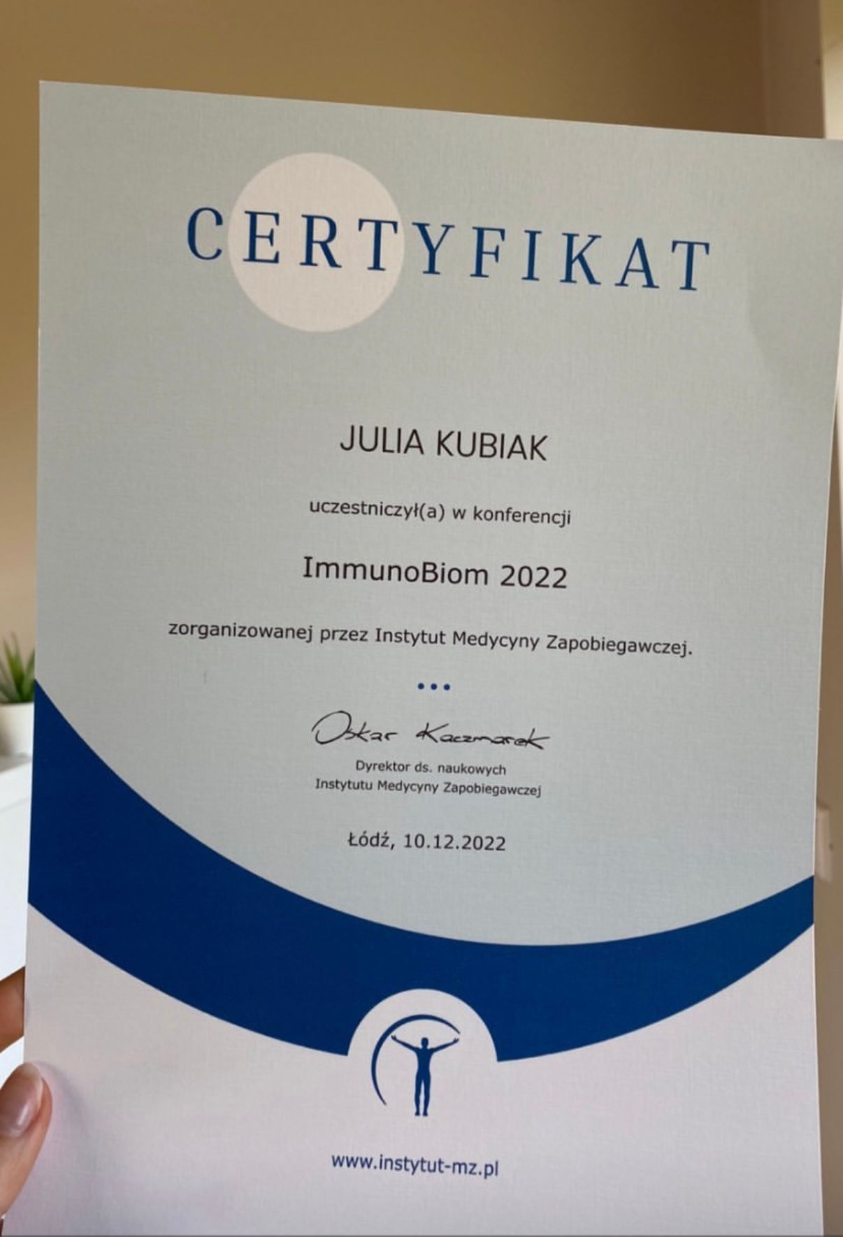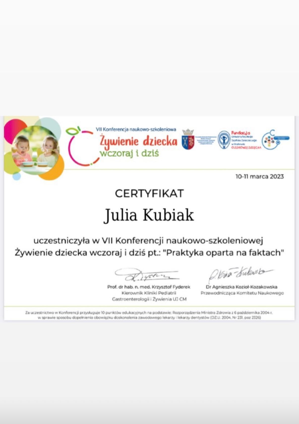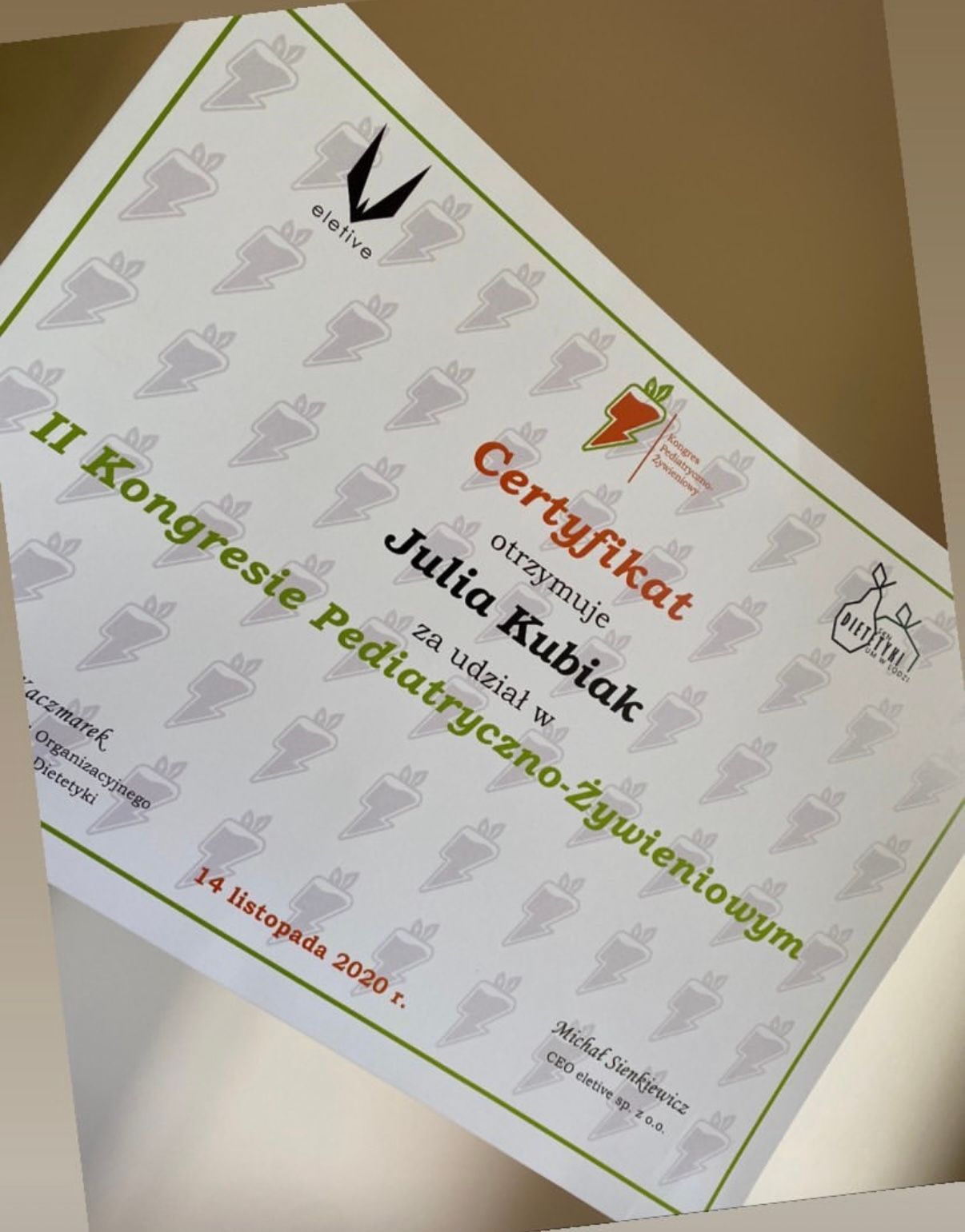Stale poszerzam swoją wiedzę, biorąc udział w kursach i konferencjach, by pracować zgodnie z aktualną wiedzą medyczną i dietetyczną. Uczestniczyłam m.in. w konferencjach dietetycznych DNŻ i Food Forum oraz w szkoleniu „Immunobiom” organizowanym przez Instytut Medycyny Żywienia w Łodzi. Odbyłam również kursy z zakresu obsługi pacjenta dietetycznego oraz interpretacji wyników badań krwi w kontekście dietoterapii.