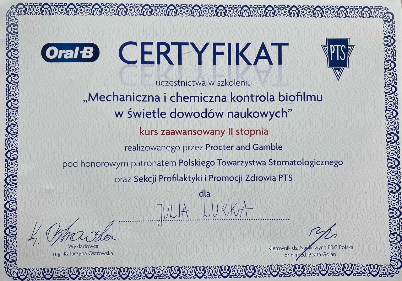 Pani Doktor jest niezwykle profesjonalna i serdeczna. Wszystko dokładnie tłumaczy, a w gabinecie panuje spokojna, przyjazna atmosfera.Zdecydowanie polecam każdemu, kto szuka dobrego i empatycznego dentysty!