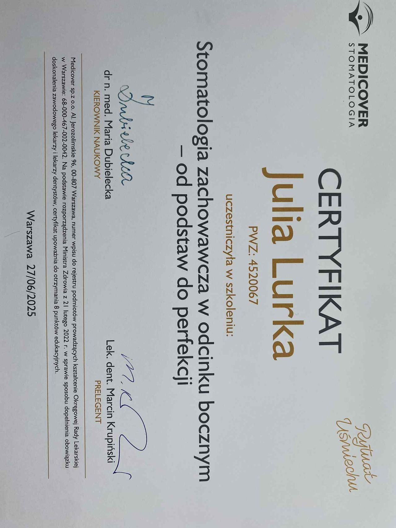 Ukończyłam kierunek lekarsko-dentystyczny w Krakowie na Uniwersytecie Jagiellońskim Collegium Medicum, staż podyplomowy odbyłam w Uniwersyteckiej Klinice Stomatologicznej w Krakowie, mając okazję szkolić się pod okiem wielu specjalistów.