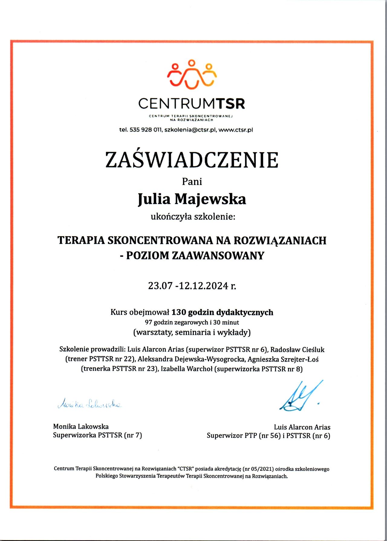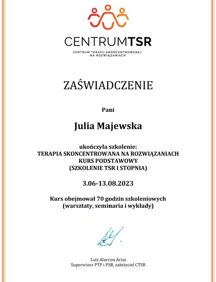 Bardzo polecam- pracowałem z Panią Julią w ramach pewnej trudniej życiowo dla mnie tematyki, gdzie opieraliśmy się na metodzie TSR i w znacznej mierze problematyka ta została już dla mnie rozwikłana, dziękuję!