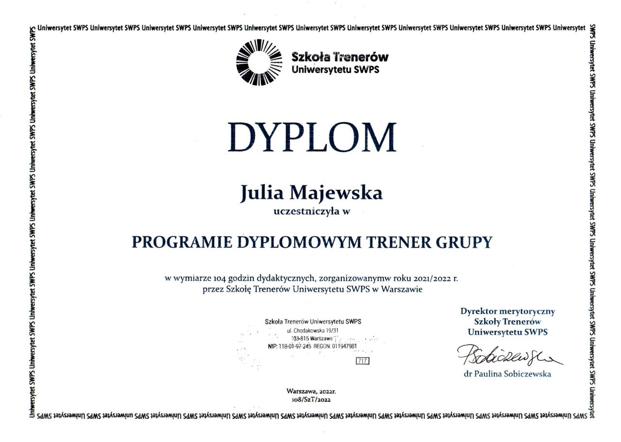 Tytuł magistra psychologii uzyskałam na Wydziale Psychologii Uniwersytetu Warszawskiego. Obecnie uczestniczę w czteroletnim szkoleniu psychoterapeutycznym w Krakowskim Centrum Psychodynamicznym, ośrodku rekomendowanym przez PTP i PTPPd. Doświadczenie zdobywałam w trakcie stażu na Oddziale Psychiatrycznym Szpitala Wolskiego w Warszawie. Ukończyłam również szkolenie I oraz II stopnia z Terapii Skoncentrowanej na Rozwiązaniach (TSR). Jestem absolwentką Szkoły Trenerów Uniwersytetu SWPS, gdzie uzyskałam certyfikat Trenera Grupy oraz Trenera Wewnętrznego.