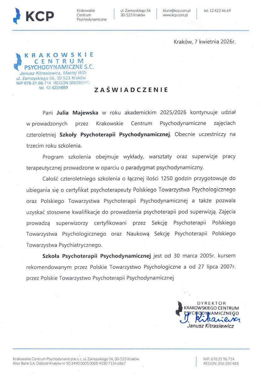Jestem psychologiem i psychoterapeutką psychodynamiczną (w trakcie szkolenia).