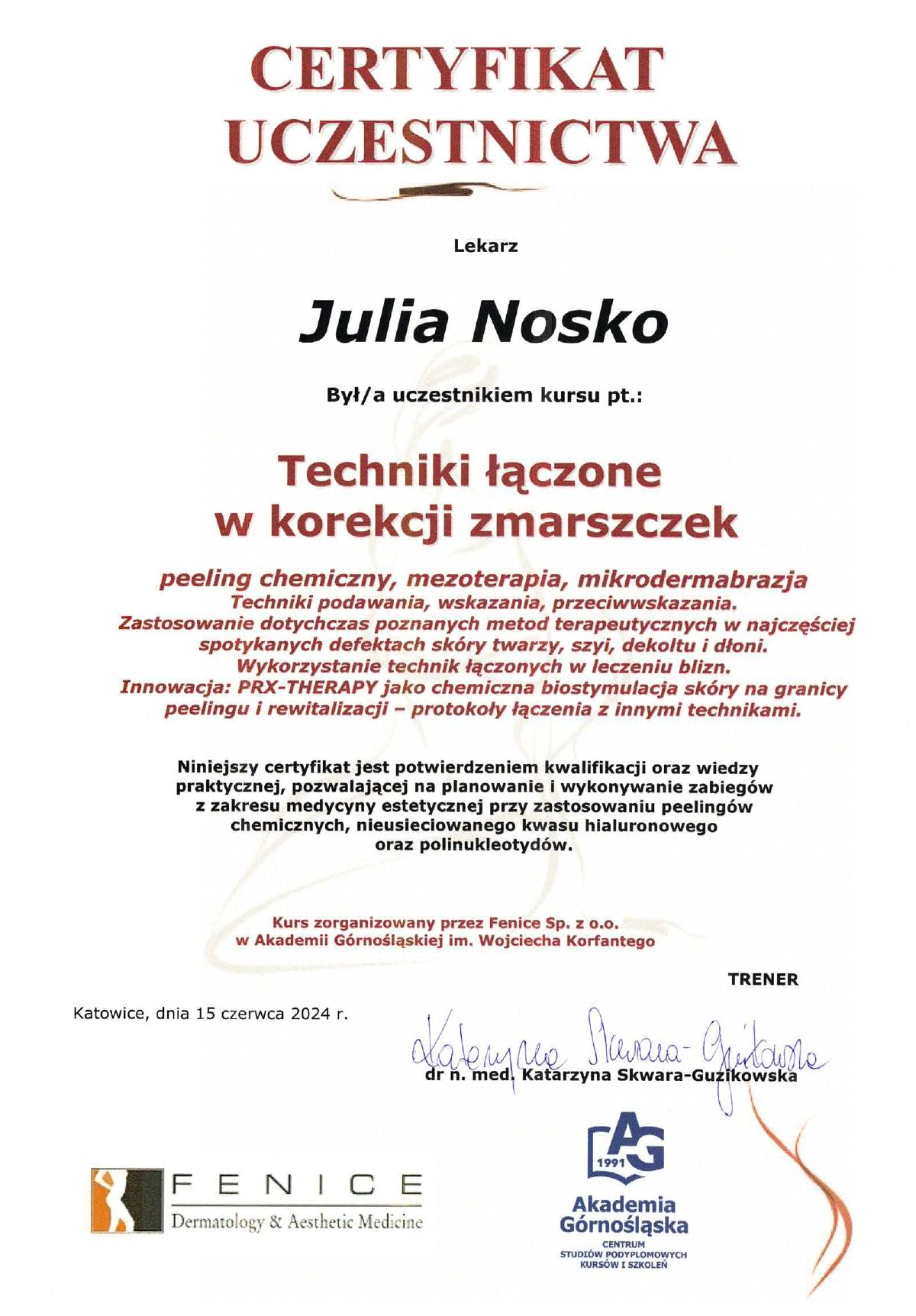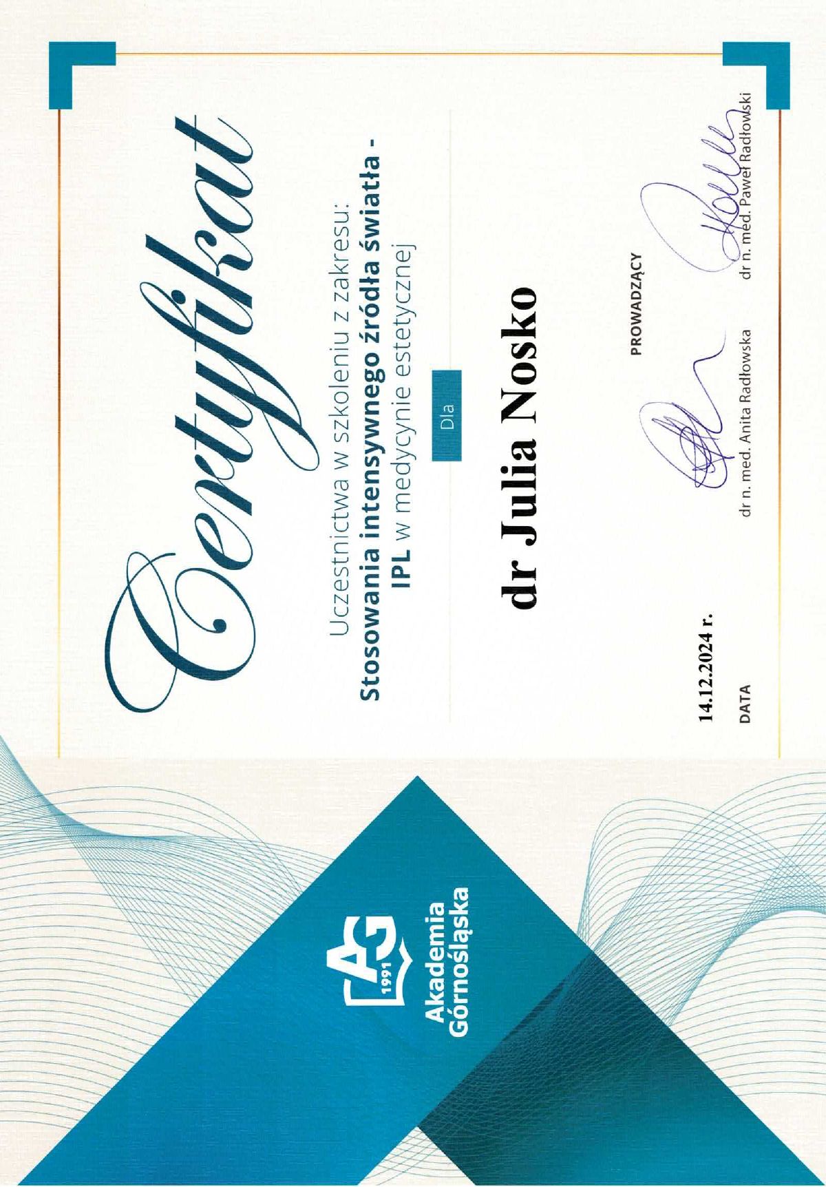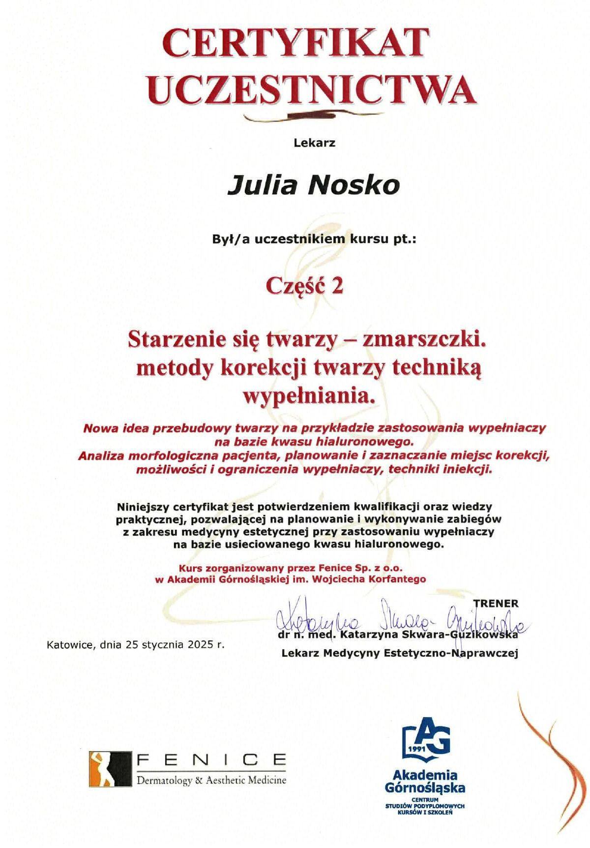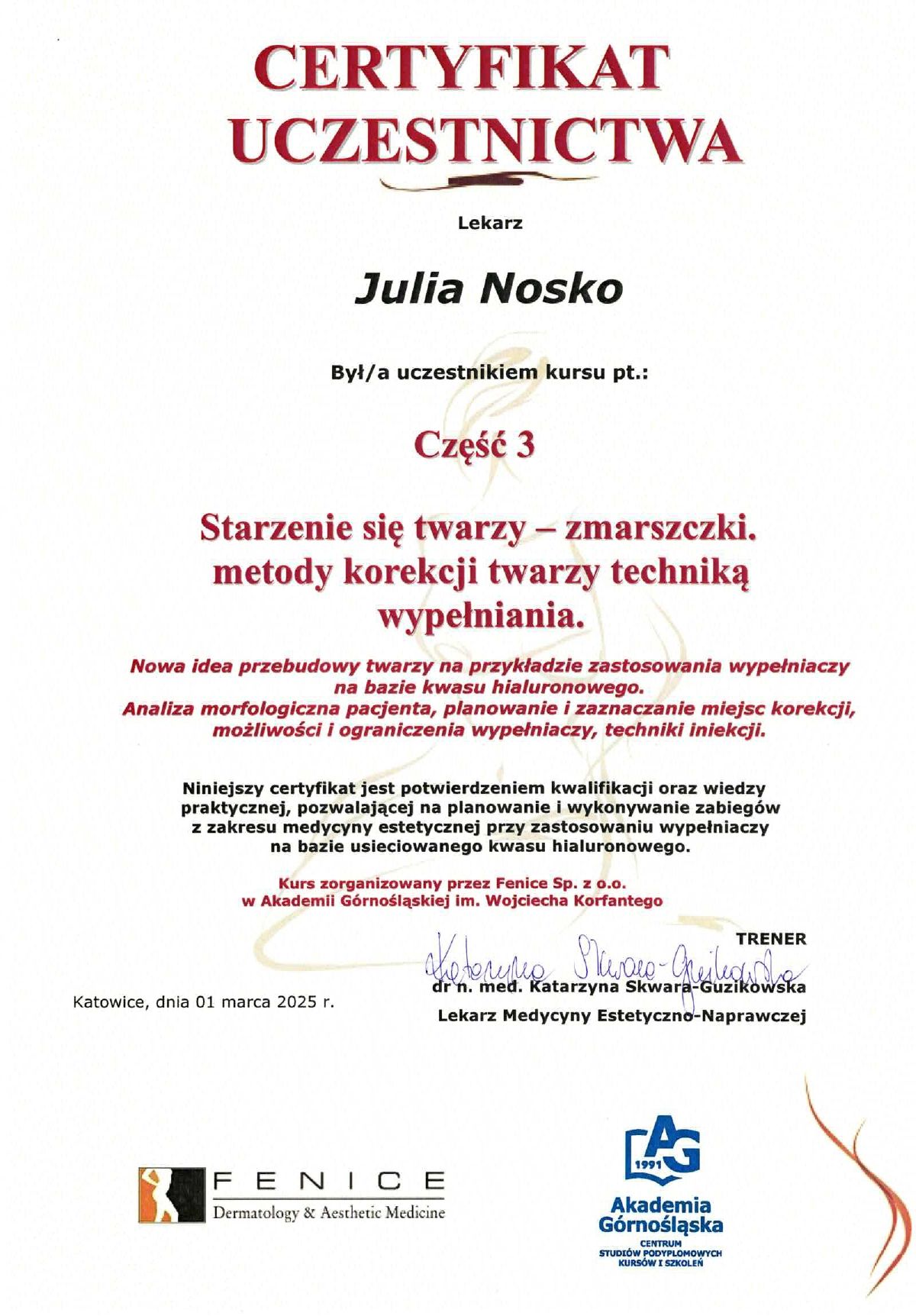 Wierzę, że medycyna estetyczna służy wydobywaniu indywidualnego piękna. Słucham potrzeb moich pacjentów i poprzez odpowiednio dobrane zabiegi dążę do tego, aby czuli się jak najlepiej w swoim ciele. Moje priorytety to bezpieczeństwo pacjenta oraz skuteczność zabiegu. Ukończyłam studia medyczne na Uczelni Łazarskiego w Warszawie oraz kształciłam się w zakresie medycyny estetycznej na Akademii Górnośląskiej w Katowicach, a także podczas licznych kursów w Warszawie i Wrocławiu. Dodatkowo pracuję w Wojskowym Instytucie Medycznym. Pracuję holistycznie, nie ograniczając się tylko do złudnej poprawy wyglądu. Stawiam na poprawę kondycji skóry i profilaktykę przeciwstarzeniową, która jest doskonałą inwestycją w zdrowie i samopoczucie.
