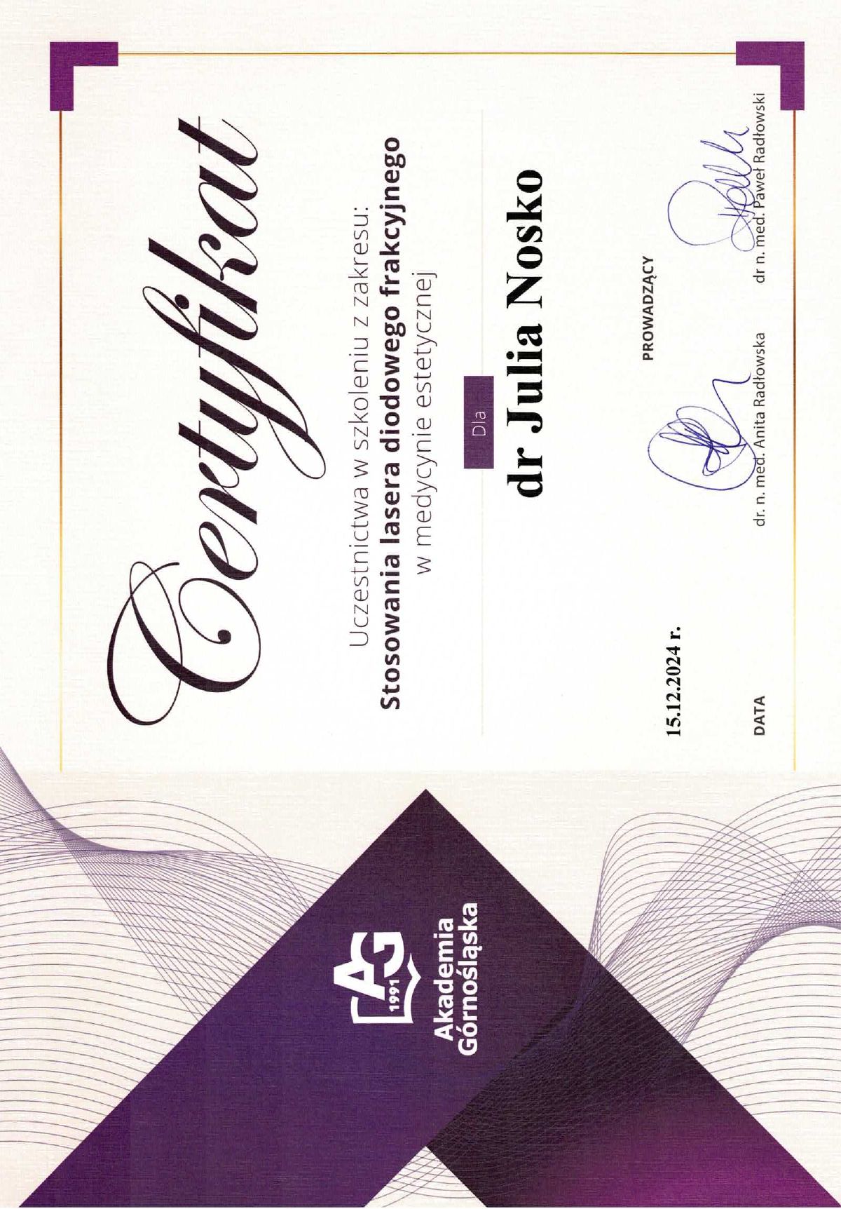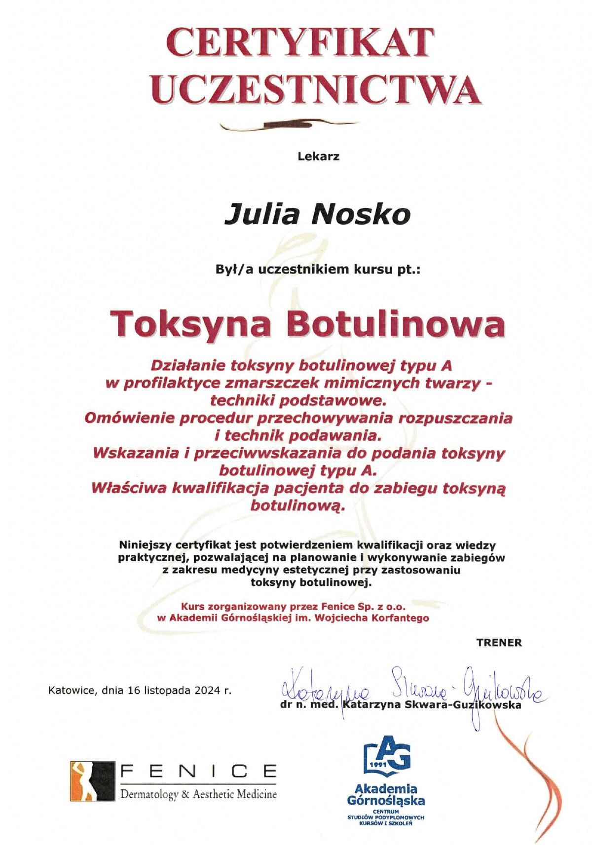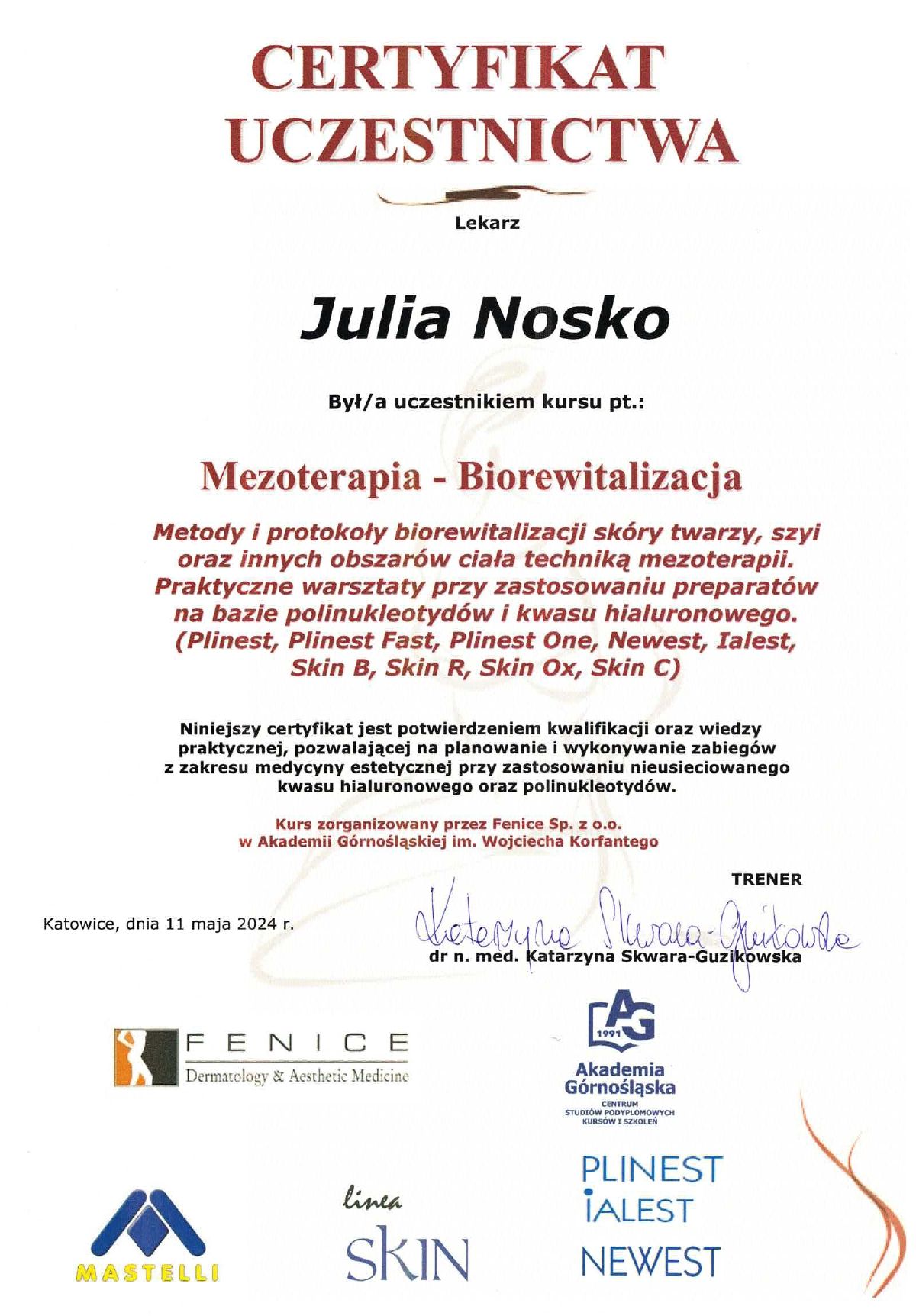 Wierzę, że medycyna estetyczna służy wydobywaniu indywidualnego piękna. Słucham potrzeb moich pacjentów i poprzez odpowiednio dobrane zabiegi dążę do tego, aby czuli się jak najlepiej w swoim ciele. Moje priorytety to bezpieczeństwo pacjenta oraz skuteczność zabiegu. Ukończyłam studia medyczne na Uczelni Łazarskiego w Warszawie oraz kształciłam się w zakresie medycyny estetycznej na Akademii Górnośląskiej w Katowicach, a także podczas licznych kursów w Warszawie i Wrocławiu. Dodatkowo pracuję w Wojskowym Instytucie Medycznym. Pracuję holistycznie, nie ograniczając się tylko do złudnej poprawy wyglądu. Stawiam na poprawę kondycji skóry i profilaktykę przeciwstarzeniową, która jest doskonałą inwestycją w zdrowie i samopoczucie.
