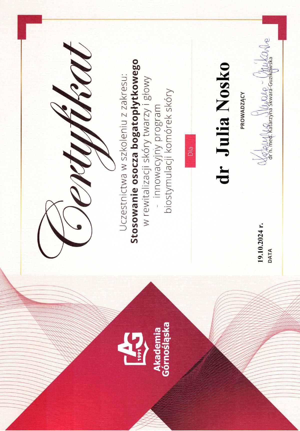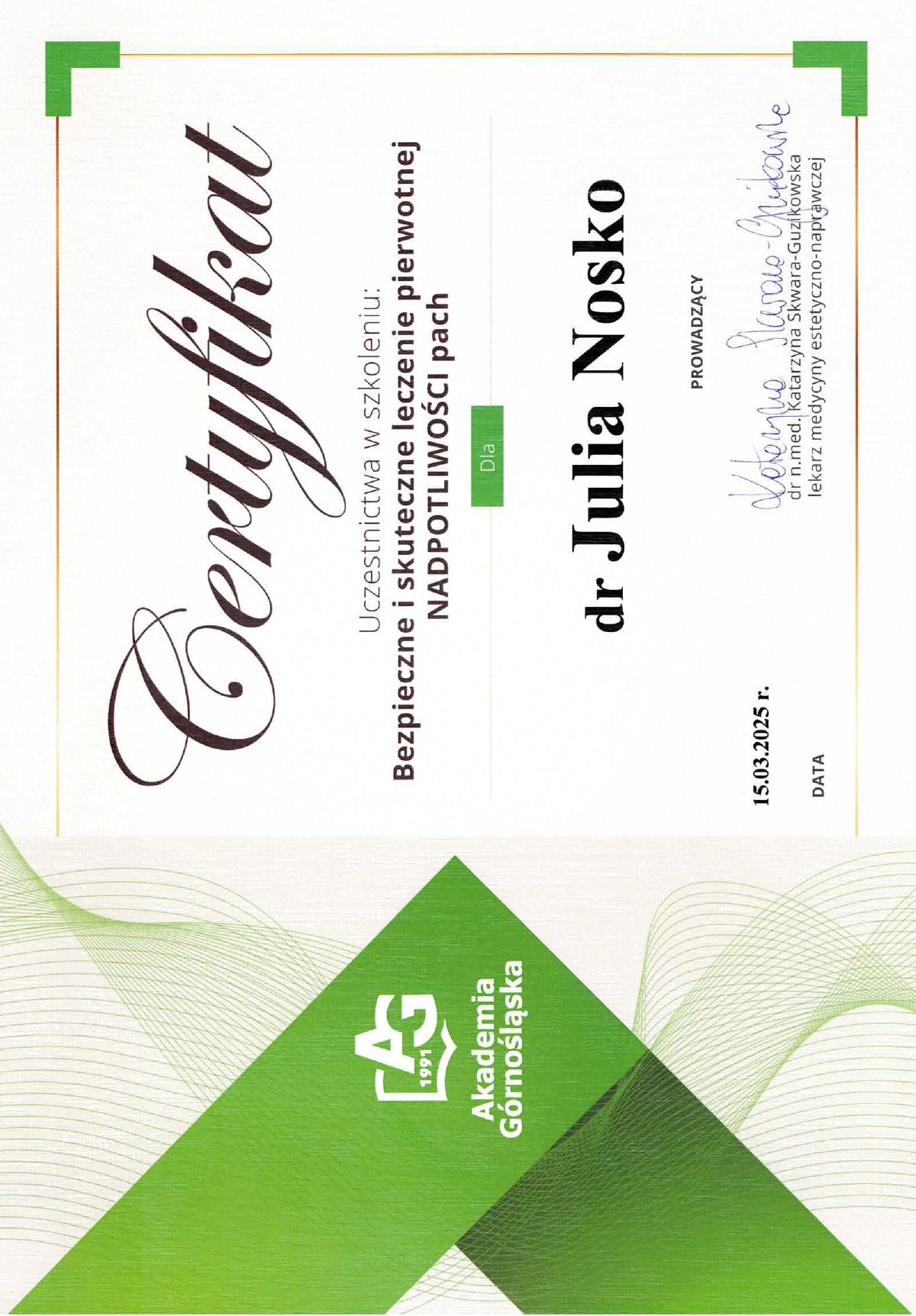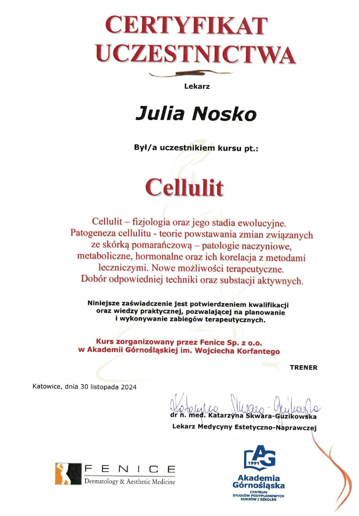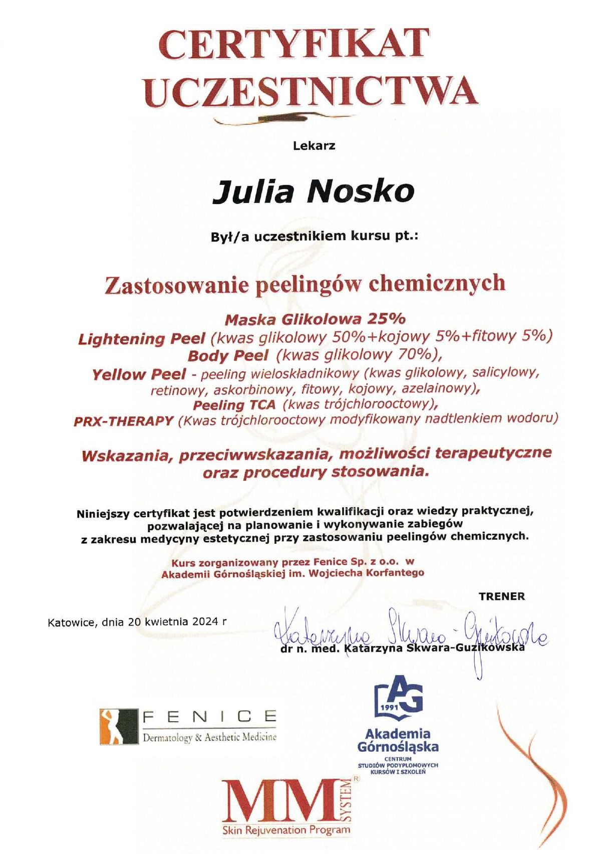 Wierzę, że medycyna estetyczna służy wydobywaniu indywidualnego piękna. Słucham potrzeb moich pacjentów i poprzez odpowiednio dobrane zabiegi dążę do tego, aby czuli się jak najlepiej w swoim ciele. Moje priorytety to bezpieczeństwo pacjenta oraz skuteczność zabiegu. Ukończyłam studia medyczne na Uczelni Łazarskiego w Warszawie oraz kształciłam się w zakresie medycyny estetycznej na Akademii Górnośląskiej w Katowicach, a także podczas licznych kursów w Warszawie i Wrocławiu. Dodatkowo pracuję w Wojskowym Instytucie Medycznym. Pracuję holistycznie, nie ograniczając się tylko do złudnej poprawy wyglądu. Stawiam na poprawę kondycji skóry i profilaktykę przeciwstarzeniową, która jest doskonałą inwestycją w zdrowie i samopoczucie.