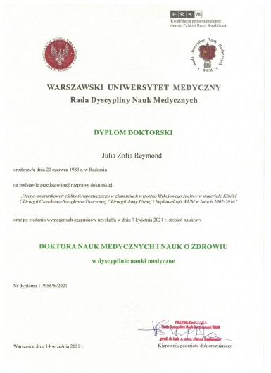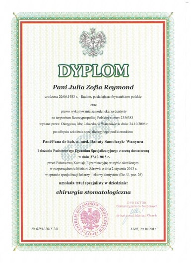 Jaki jest zakres porad oferowanych przez Julia Reymond?Julia Reymond to chirurg stomatologiczny. Na podstawie swojego doświadczenia i wykształcenia Julia Reymond oferuje usługi takie jak: chirurgia stomatologiczna, konsultacja implantologiczna, konsultacja chirurga stomatologicznego, Implanty Astra Tech Implant System, operacyjne usunięcie zęba całkowicie zatrzymanego, chirurgiczne podniesienie dna zatoki szczękowej, Badanie histopatologiczne, chirurgiczne usuwanie zębów zatrzymanych 8, chirurgiczne poszerzenie wyrostka, chirurgiczne usuwanie ósemek.