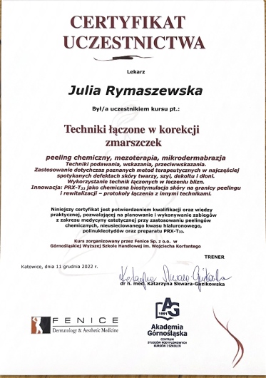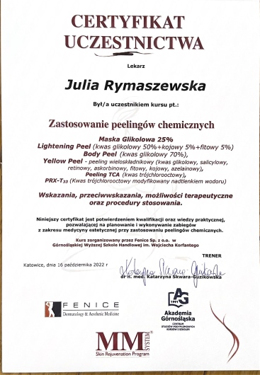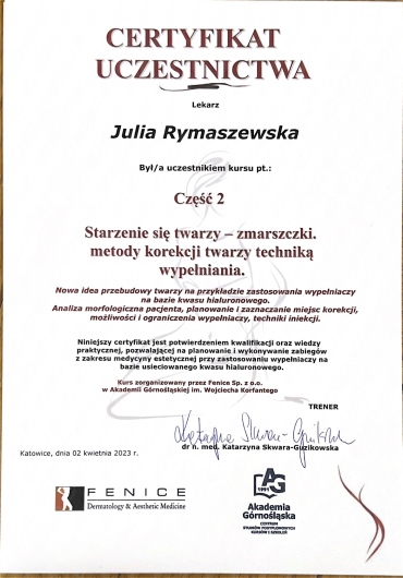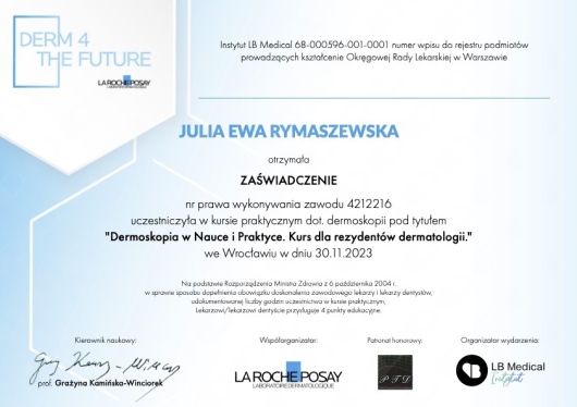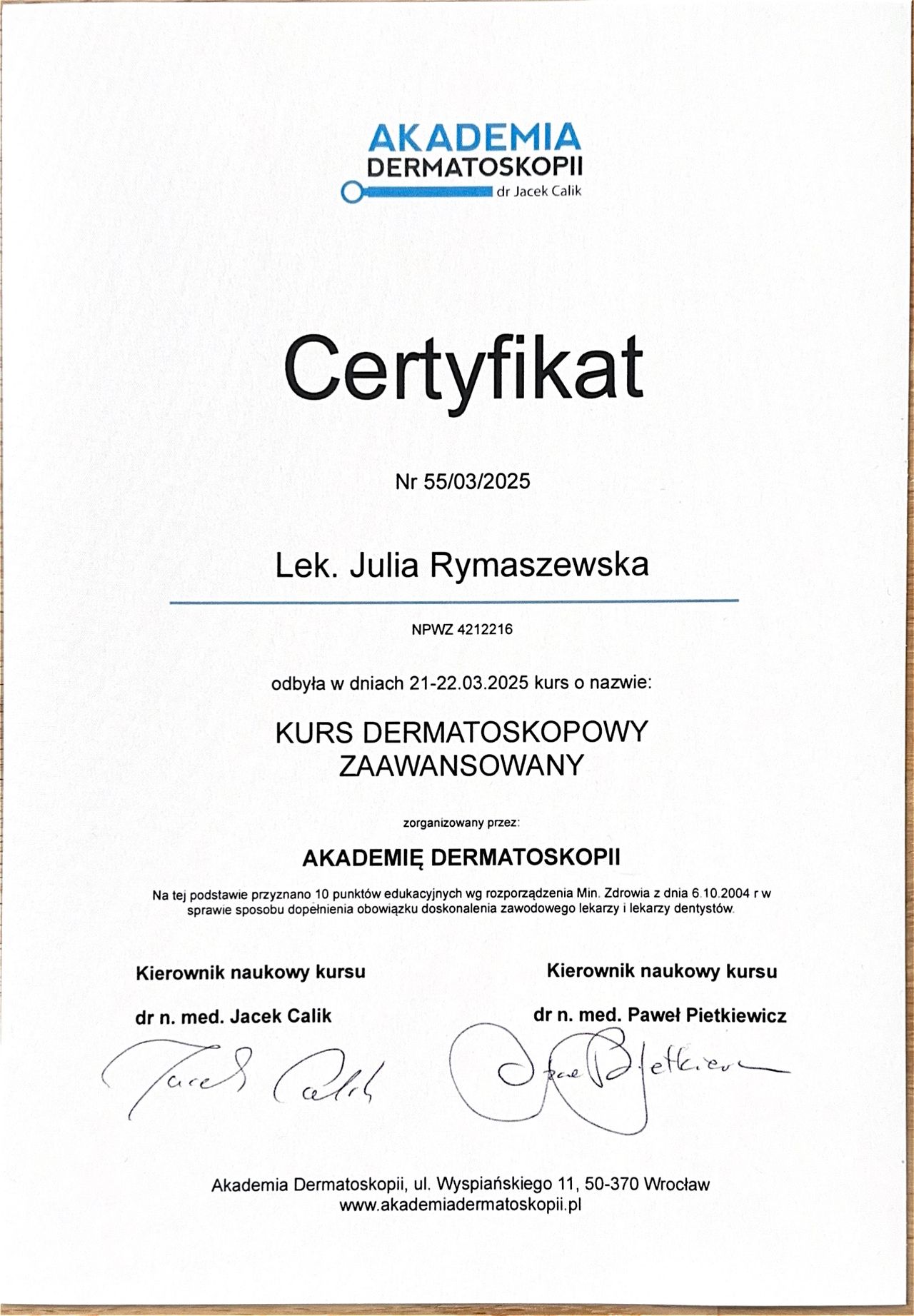 Jaki jest zakres porad oferowanych przez Julia Rymaszewska?Julia Rymaszewska to w trakcie specjalizacji (dermatolog), lekarz wykonujący zabiegi medycyny estetycznej. Na podstawie swojego doświadczenia i wykształcenia Julia Rymaszewska oferuje usługi takie jak: Konsultacja z zakresu medycyny estetycznej, Dermatoskopia – ocena znamion, guzków skórnych, kriochirurgia, konsultacja dermatologiczna, chirurgiczne usuwanie zmian skórnych, Laserowe zamykanie naczynek, Mezoterapia igłowa skóry głowy, DERMAPEN mezoterapia mikroigłowa - twarz, Konsultacja dermatologiczna dzieci, Mezoterapia igłowa twarz.