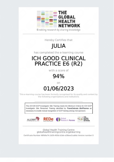 Odbyła szkolenie organizowane przez Royal College of Surgeons w Dublinie, dotyczące etyki i rzetelności w prowadzeniu badań naukowych w medycynie.