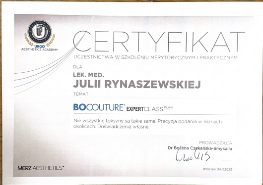 Jestem bardzo zadowolona z wizyt u dr Julii, zapytała mnie i wysłuchała co mi przeszkadza, co chciałabym zmienić. Potem zbadała (dosłownie, nawet pytała o jakieś choroby i wyniki badań!), zaproponowała zabiegi ale tez cały plan pielęgnacji. Tłumaczy co robi więc się człowiek nie boi. Efekty widać, wygląd się poprawił ale jest bardzo naturalnie. zdecydowanie polecam
