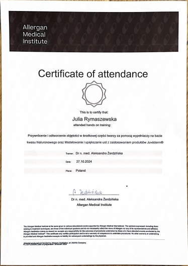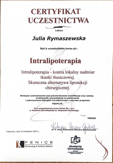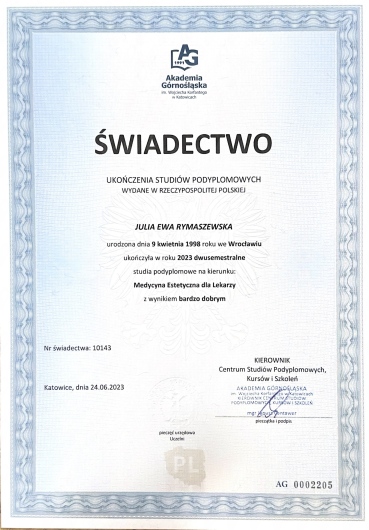 Ukończyła specjalistyczne studia podyplomowe dla lekarzy z zakresu medycyny estetycznej na Akademii Górnośląskiej. Od 2022 roku współpracuje z dr Małgorzatą Bagłaj, rozwijając pod jej okiem swoje umiejętności praktyczne.