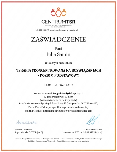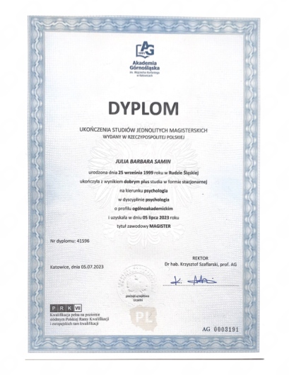 Jestem w trakcie studiów podyplomowych z Podejścia i Terapii Skoncentrowanej na Rozwiązaniach akredytowanych przez PTTSR na Akademii Humanitas. Ukończyłam studia magisterskie z psychologii o specjalności klinicznej na Akademii Górnośląskiej im. Wojciecha Korfantego w Katowicach.