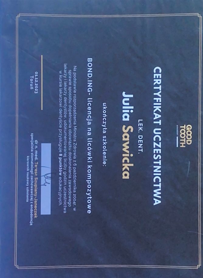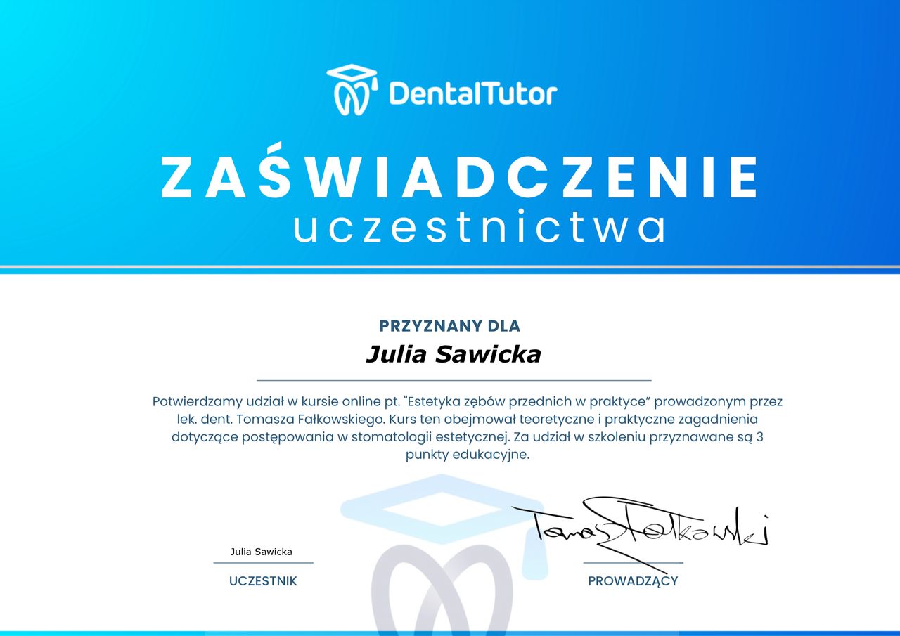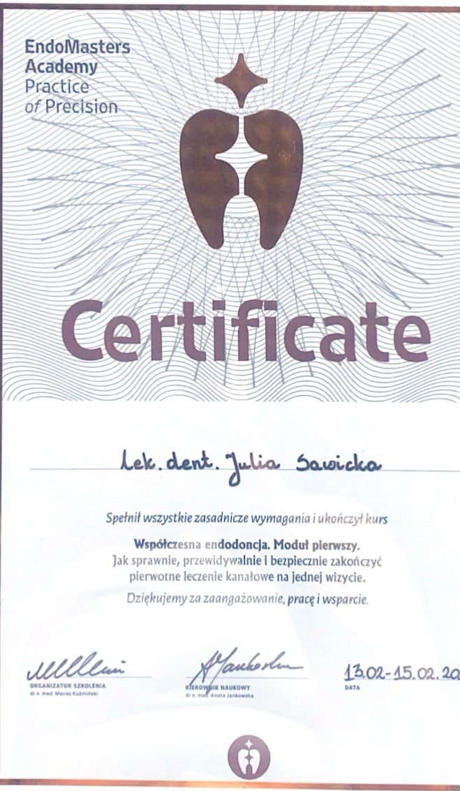 Nieustannie poszerza swoje kwalifikacje, uczestnicząc w licznych kursach, szkoleniach i konferencjach. Dzięki temu jej pacjenci mają pewność, że leczenie odbywa się zgodnie z najnowszymi standardami i przy użyciu nowoczesnych metod.