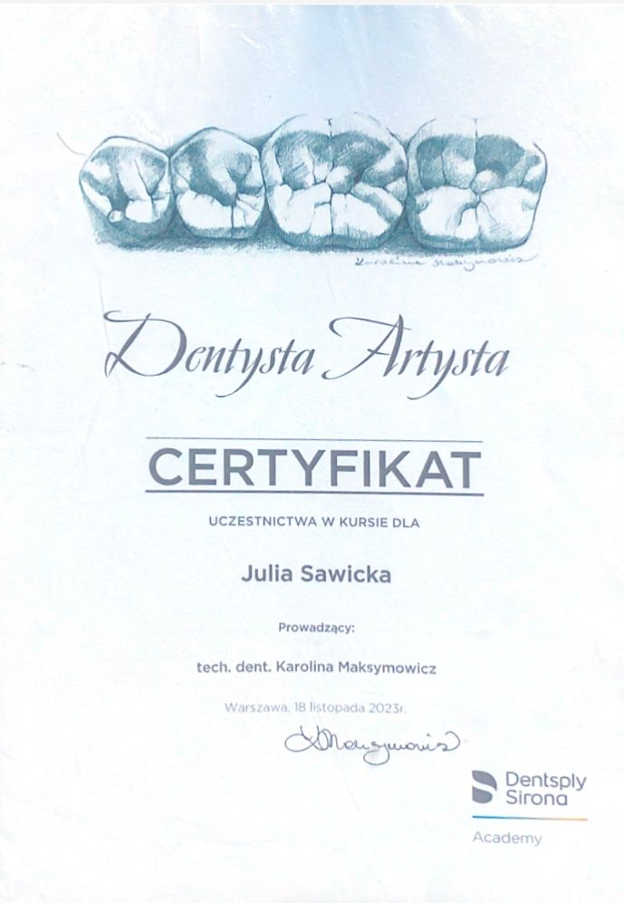 Jaki jest zakres porad oferowanych przez Julia Sawicka?Julia Sawicka to stomatolog. Na podstawie swojego doświadczenia i wykształcenia Julia Sawicka oferuje usługi takie jak: Konsultacja stomatologiczna, stomatologia dziecięca, konsultacja stomatologiczna dzieci.