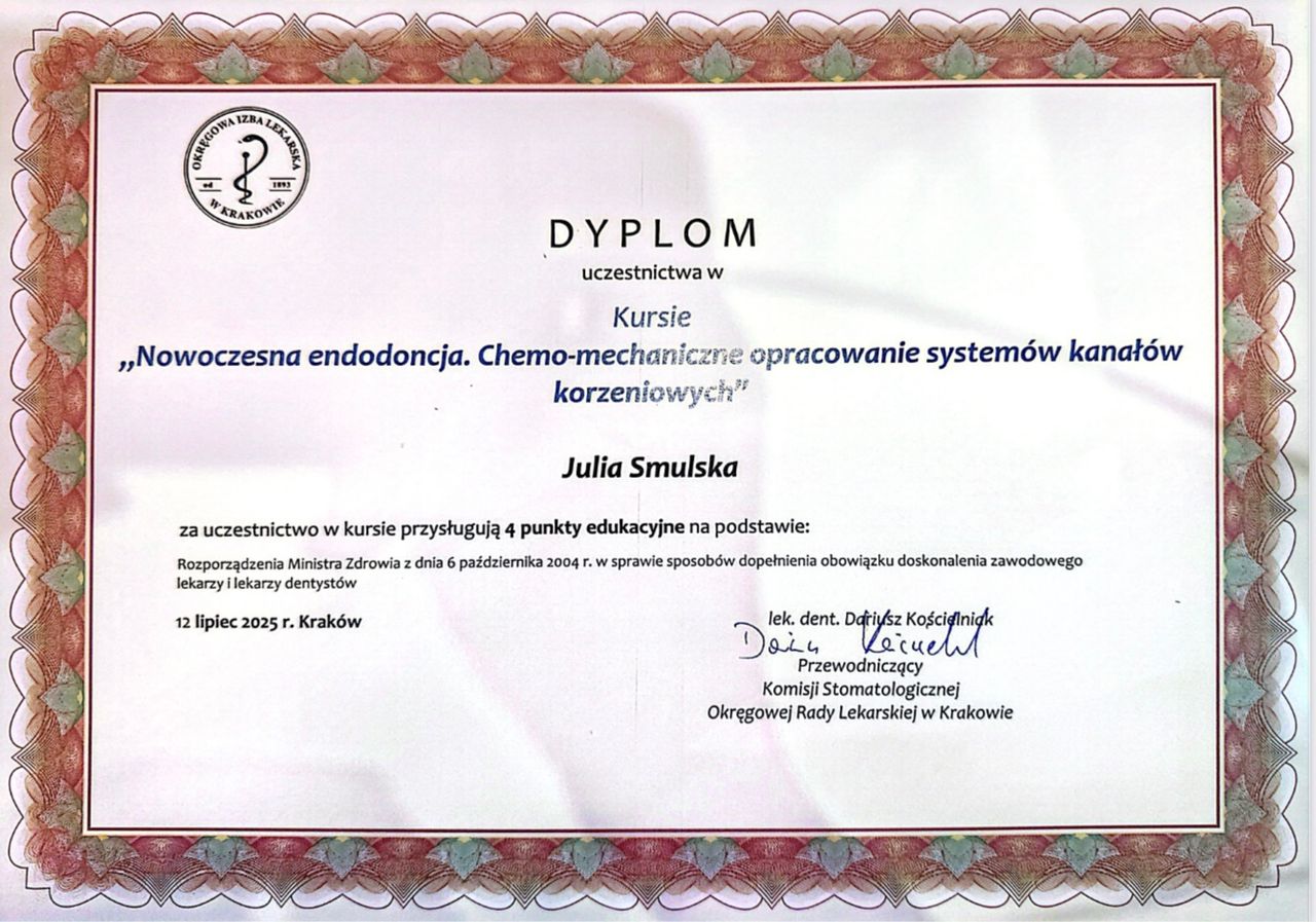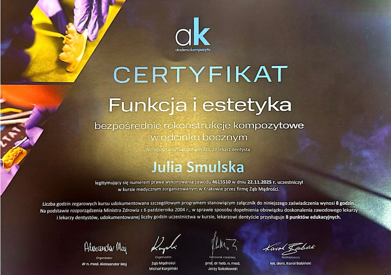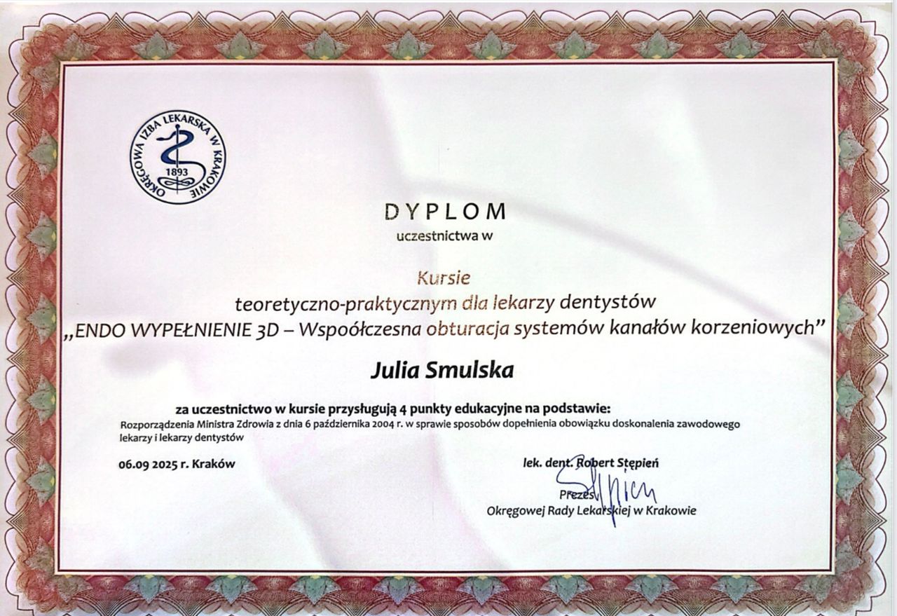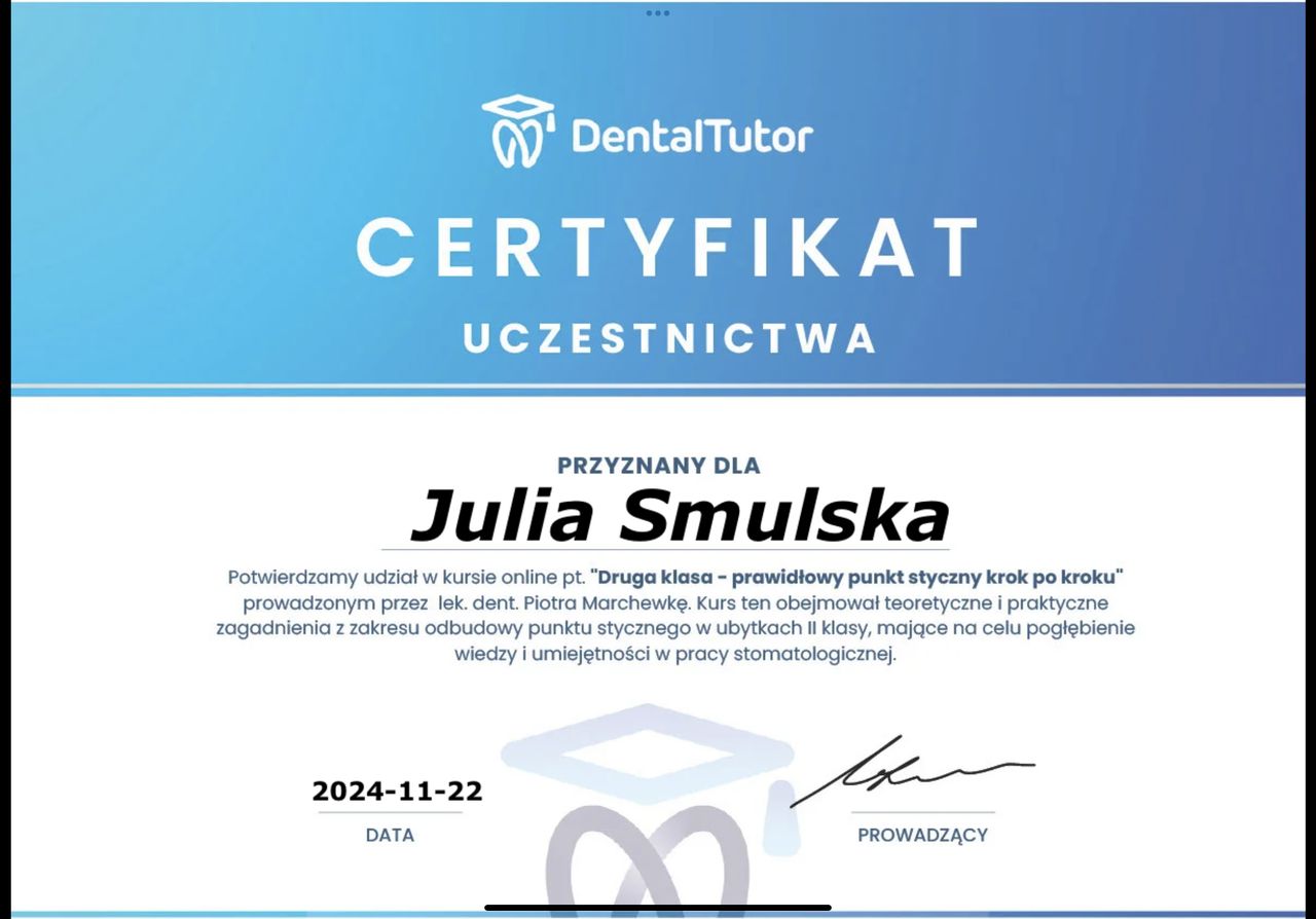 Jaki jest zakres porad oferowanych przez Julia Smulska?Julia Smulska to stomatolog. Na podstawie swojego doświadczenia i wykształcenia Julia Smulska oferuje usługi takie jak: Konsultacja stomatologiczna, badania stomatologiczne, odbudowa zębów, Wypełnienie, Rentgen cyfrowy zęba, Wypełnienie materiałem kompozytowym, rentgen zębów, RTG pantomogram, RTG zęba, tomografia komputerowa.