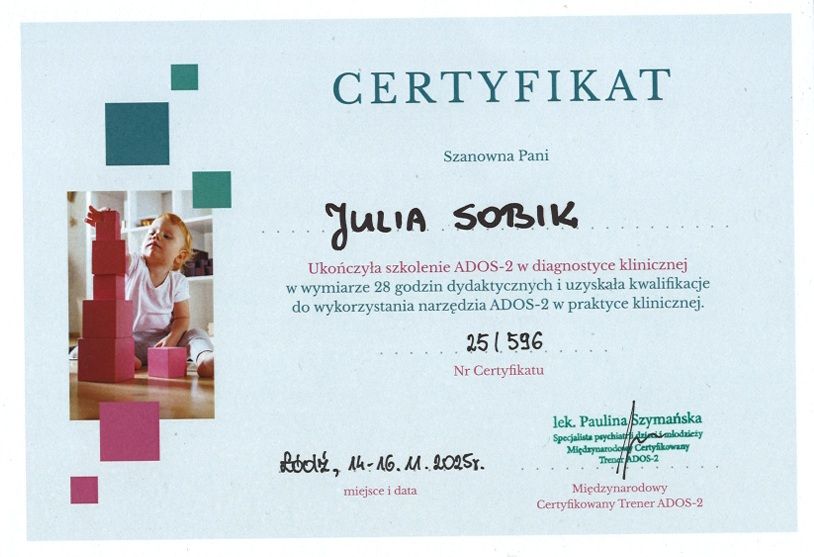 Jaki jest zakres porad oferowanych przez Julia Sobik?Julia Sobik to psycholog. Na podstawie swojego doświadczenia i wykształcenia Julia Sobik oferuje usługi takie jak: diagnoza ADHD dla dorosłych, Badanie MMPI-2, Diagnoza zaburzeń osobowości - SCID-5-PD, poradnictwo dla rodziców, Diagnoza ADHD dzieci i młodzieży, konsultacja psychologiczna dzieci i młodzieży, Konsultacja psychologiczna (dorośli).