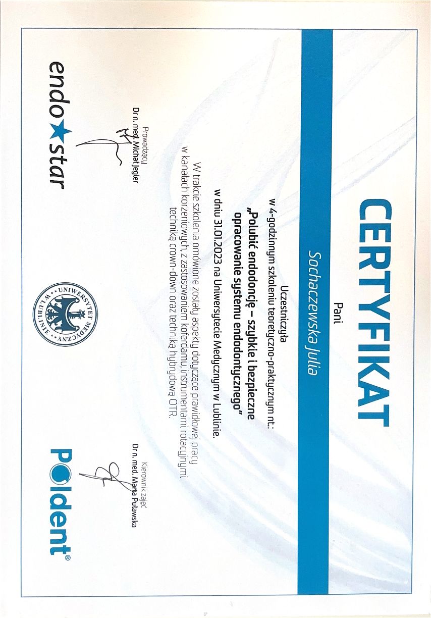 Jestem absolwentką Uniwersytetu Medycznego w Lublinie, gdzie zdobyłam solidne podstawy teoretyczne i praktyczne w zakresie stomatologii. Staż podyplomowy odbyłam w Uniwersyteckim Centrum Stomatologii, które umożliwiło mi rozwój pod okiem doświadczonych specjalistów oraz pracę z pacjentami w różnym wieku i z różnorodnymi potrzebami. Już w trakcie studiów angażowałam się naukowo jako członkini Studenckiego Koła Naukowego przy Klinice Hematologii, Onkologii i Transplantologii Dziecięcej.