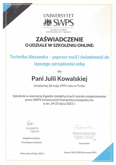 *** W zawodzie psychologa pracuję odkąd skończyłam studia magisterskie na Uniwersytecie Łódzkim (2016). Ukończyłam również studia podyplomowe z psychologii transportu na Uniwersytecie Warszawskim. Doświadczenie zdobywałam m.in. w przychodni POZ, Powiatowym Centrum Pomocy Rodzinie, przy realizacji wielu projektów EFS dla młodych osób (setki godzin rozmów). Współpracowałam z Urzędem Miasta Łodzi i AS-Medica Sp. z o.o., przy projekcie Przepis na Zdrowie. Udzielałam konsultacji i wsparcia psychologicznego przy Gminnej Komisji Rozwiązywania Problemów Alkoholowych w Brudzewie (woj. wielkopolskie). ***