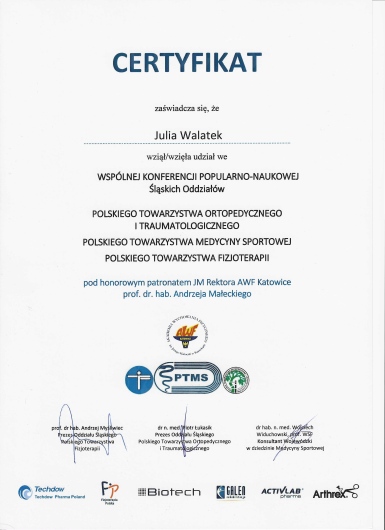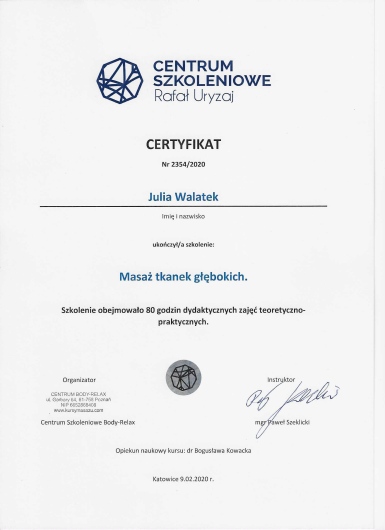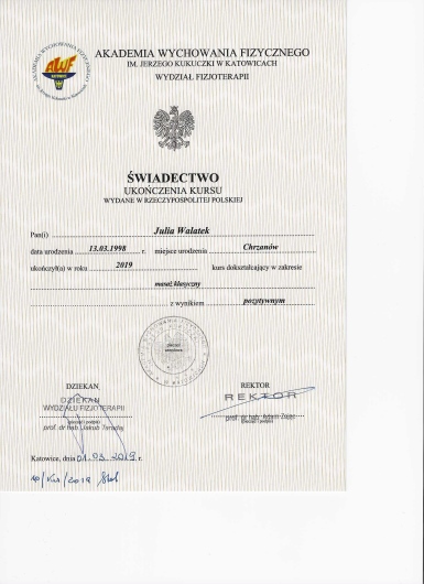 Jaki jest zakres porad oferowanych przez Julia Walatek?Julia Walatek to fizjoterapeuta. Na podstawie swojego doświadczenia i wykształcenia Julia Walatek oferuje usługi takie jak: kinesiotaping, konsultacja fizjoterapeutyczna (pierwsza wizyta), Fala uderzeniowa, Ocena siły mięśniowej, trening funkcjonalny, konsultacja fizjoterapeutyczna (kolejna wizyta), fizjoterapia, konsultacja fizjoterapeutyczna (weekend).