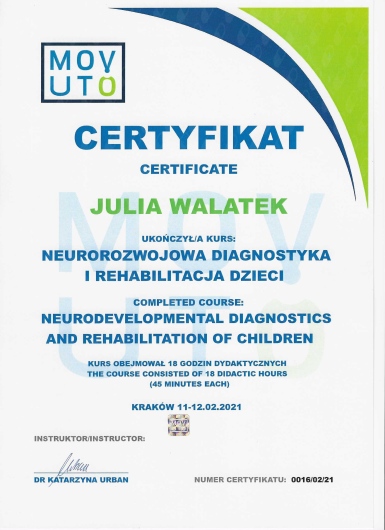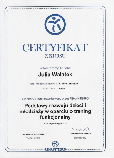 Pani Julia Walatek to wspaniała specjalistka z ogromnym sercem do dzieci. Już od pierwszej wizyty stworzyła przyjazną i bezpieczną atmosferę, dzięki czemu moje dziecko czuło się swobodnie i chętnie współpracowało. Ćwiczenia były dobrane indywidualnie, a każda wizyta dokładnie wytłumaczona – wiedziałam, co i dlaczego robimy oraz jak wspierać dziecko także w domu. Pani Julia jest cierpliwa, uśmiechnięta i bardzo zaangażowana, a postępy widoczne są już po kilku spotkaniach. Serdecznie polecam każdemu rodzicowi, który szuka profesjonalnej i życzliwej pomocy dla swojego dziecka.