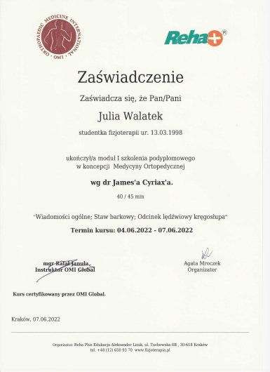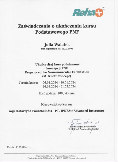 Wizyta przebiegła w bardzo miłej atmosferze. Pani Julia wszystko dokładnie tłumaczyła, wyjaśniała wątpliwości, jasno komunikowała jakich informacji potrzebuje żeby wdrożyć odpowiednie ćwiczenia. Jestem bardzo zadowolona.