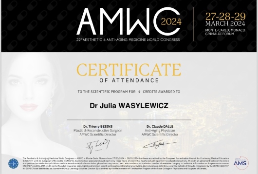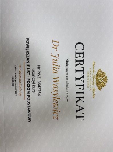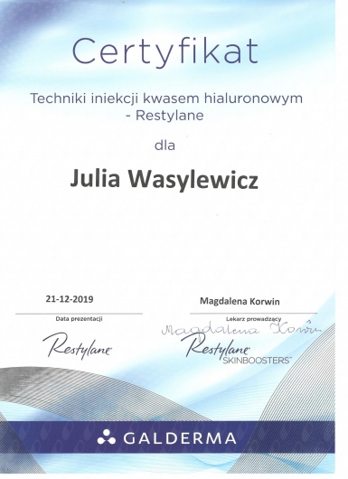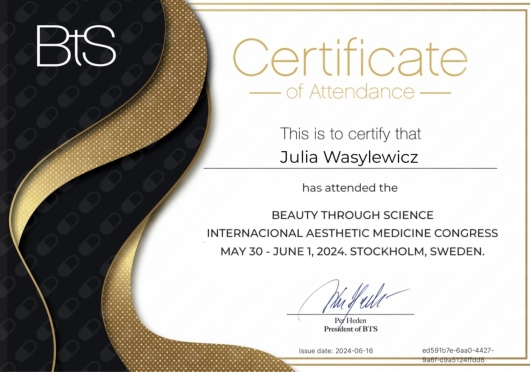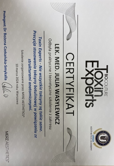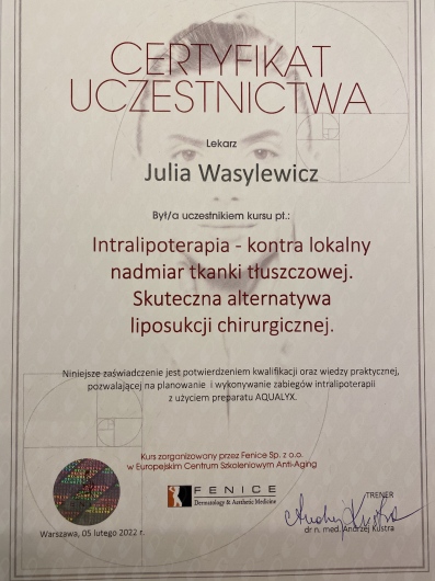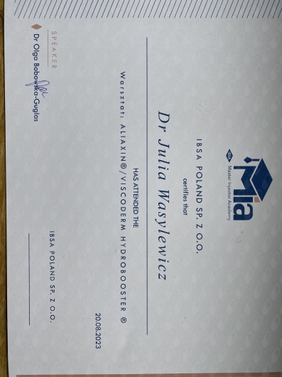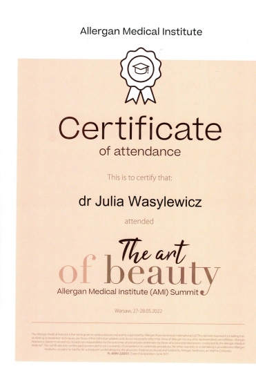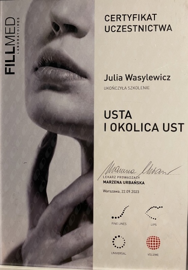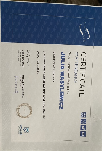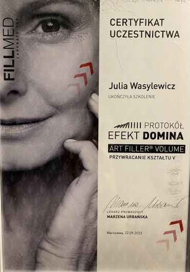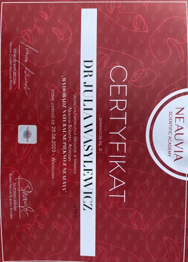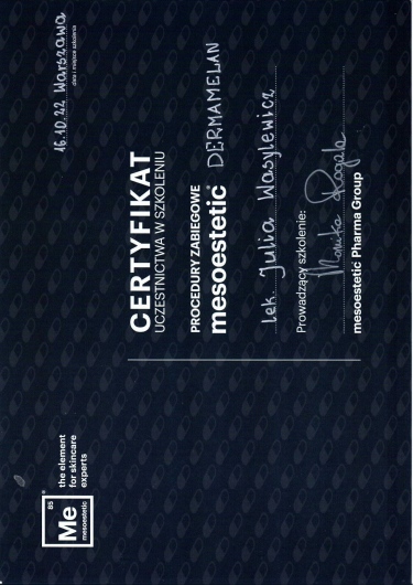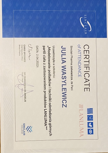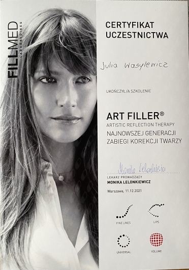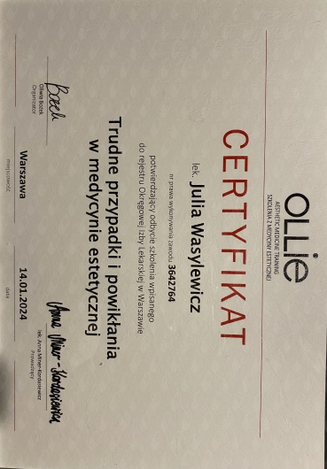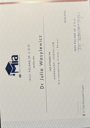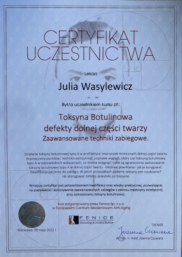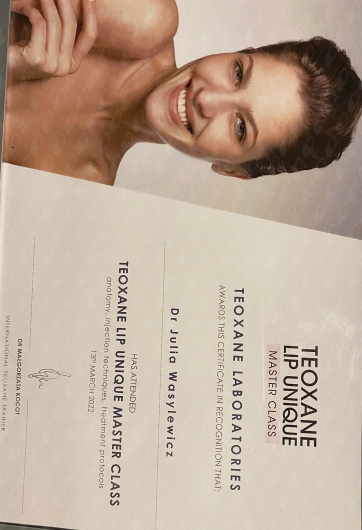 Ukończyłam Międzynarodowe Centrum Kształcenia Medycyny Anti-Aging. Jako jedna z 100 pierwszych polskich lekarzy uzyskałam certyfikat umiejętności lekarskiej - Medycyna Estetyczno-Naprawcza, co jest uhonorowaniem doświadczenia i wiedzy w Medycynie Estetycznej.