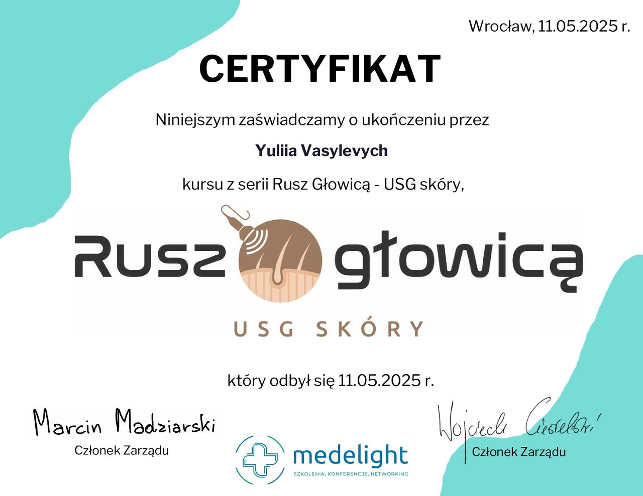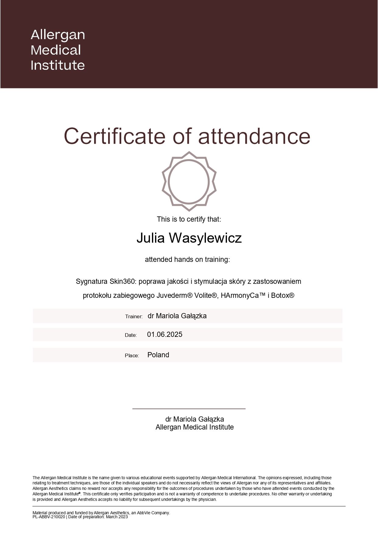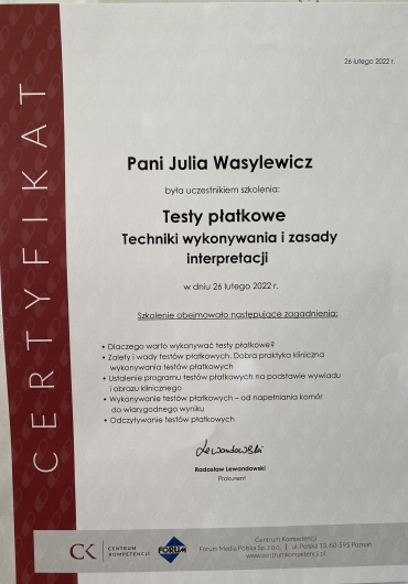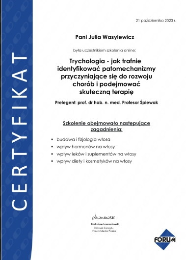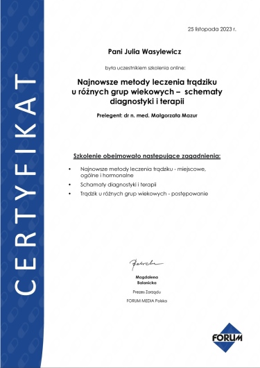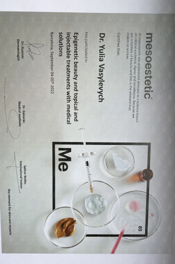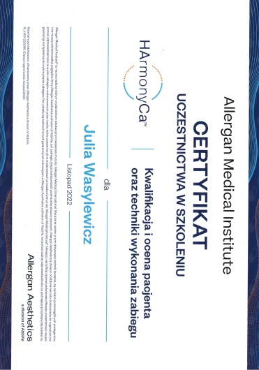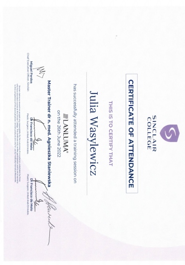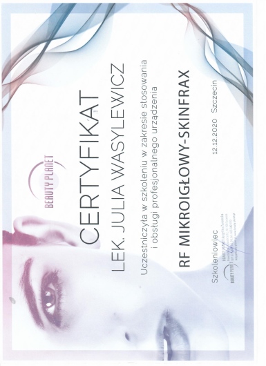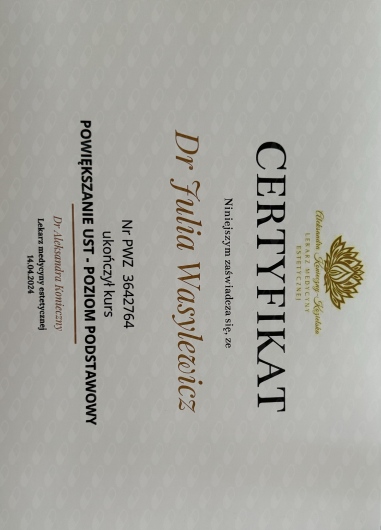 Ukończyłam Międzynarodowe Centrum Kształcenia Medycyny Anti-Aging. Jako jedna z 100 pierwszych polskich lekarzy uzyskałam certyfikat umiejętności lekarskiej - Medycyna Estetyczno-Naprawcza, co jest uhonorowaniem doświadczenia i wiedzy w Medycynie Estetycznej.
