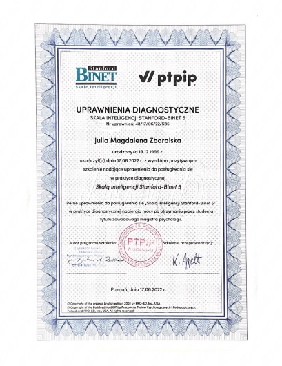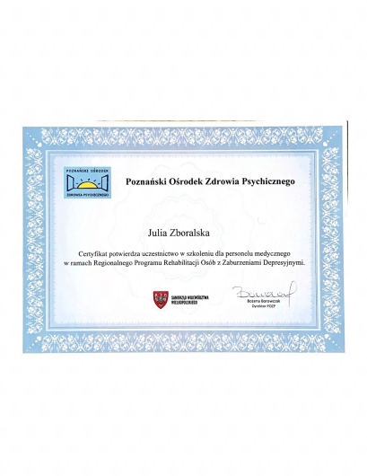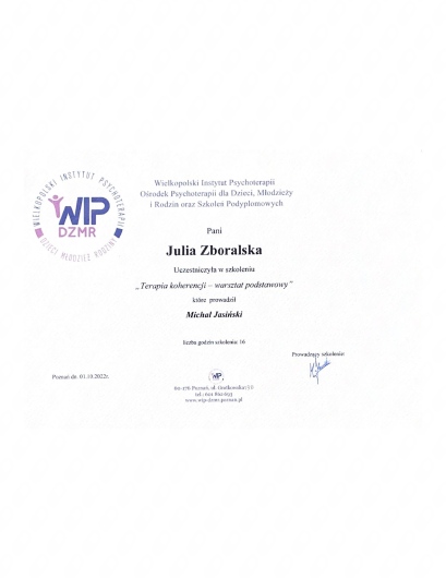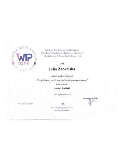 Ukończyłam liczne szkolenia i kursy, w tym dwuetapowy kurs z terapii koherencji, szkolenie z udzielania wsparcia osobom zmagającym się z zaburzeniami depresyjnymi i szkolenie z diagnozowania trudności intelektualnych u dzieci i młodzieży, według najnowszych narzędzi diagnostycznych.
