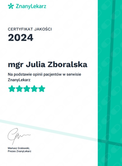 Czy Julia Zboralska przyjmuje online, bez konieczności pojawiania się w placówce?Tak, Julia Zboralska oferuje konsultacje online. Wybierz opcję „konsultacja online” przy umawianiu wizyty, a zobaczysz dostępne terminy.