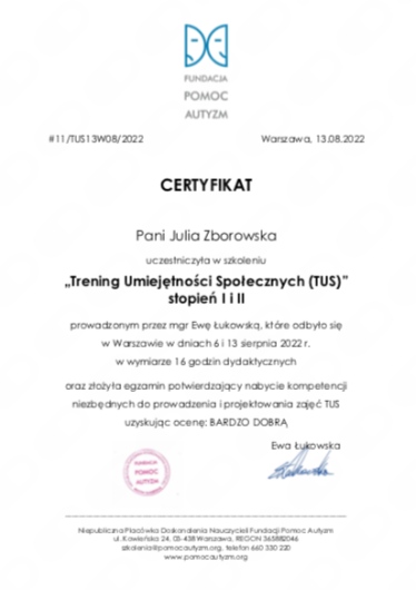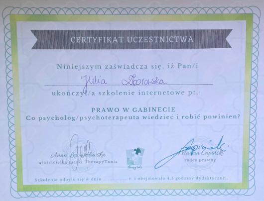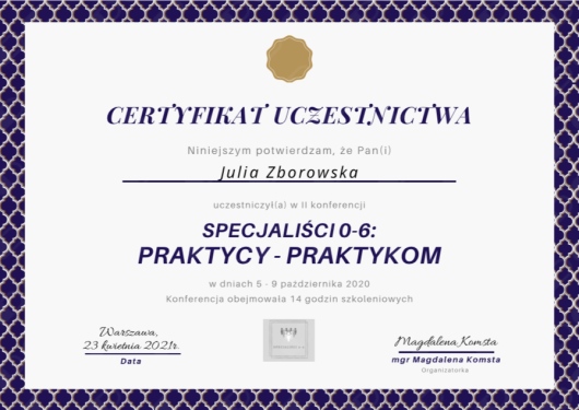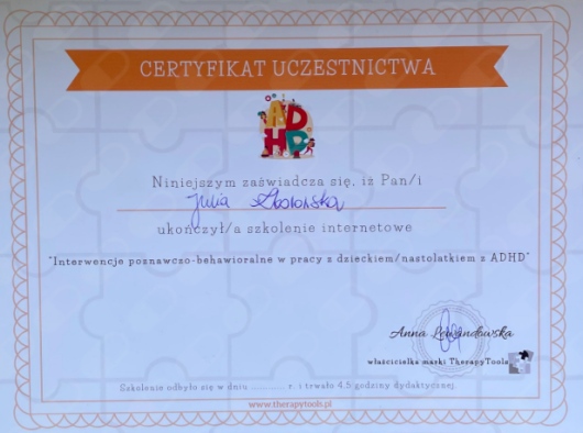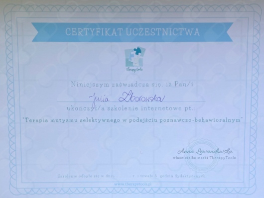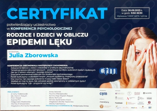 Uczestniczyłam w licznych konferencjach i szkoleniach, których głównym tematem był rozwój dzieci i młodzieży, a poruszane tam zagadnienia to m.in.: mutyzm wybiórczy, seksualność, lęki.