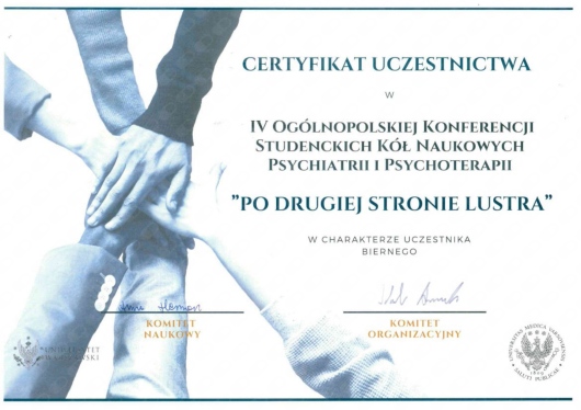 Doświadczenie w pracy zdobywałam odbywając staż na Ogólnym Oddziale Psychiatrycznym w Ostrowie Wielkopolskim, Wojewódzkim Zakładzie Opieki Psychiatrycznej w Sokołówce oraz jako wolontariuszka fundacji Sieć Przyjaciół Zdrowia Psychicznego wspierając osoby doświadczające trudności na tle zdrowia psychicznego oraz pełniąc rolę koordynatorki Zespołu Rekrutacji. Prowadziłam również warsztaty dla dzieci w Autorskiej Szkole Podstawowej Navigo, warsztaty o zdrowiu psychicznym dla studentów i studentek oraz trening umiejętności społecznych dla dzieci w spektrum autyzmu.