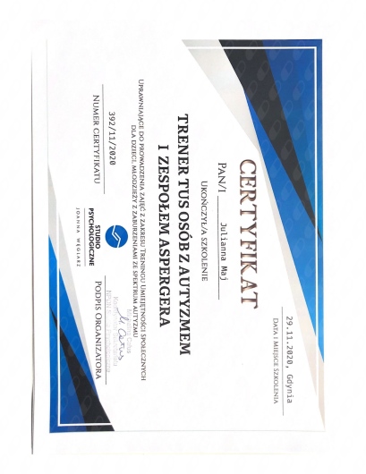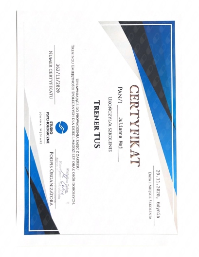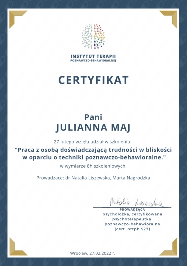 Jestem dyplomowaną psycholożką, absolwentką Uniwersytetu Humanistycznospołecznego SWPS we Wrocławiu, na którym uzyskałam tytuł magistra psychologii o specjalności klinicznej i biznesowej. Ukończyłam roczne studium Interwencji Kryzysowej w Instytucie Terapii Poznawczo-Behawioralnej oraz studium Terapii Skoncentrowanej na Rozwiązaniach (1 stopień). Wiosną 2023 roku rozpoczęłam 4-letnią, akredytowaną szkołę psychoterapii w podejściu poznawczo-behawioralnym Szkoły Psychoterapii Crescentia.