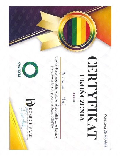 Jako psycholożka udzielam poradnictwa psychologicznego. Wspieram osoby doświadczające kryzysu, utknięcia, trudności w relacjach. Kieruję się otwartością i akceptacją wszelkich różnorodności. Wspieram również osoby LGBTQIAP+ oraz ich bliskich.