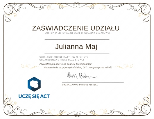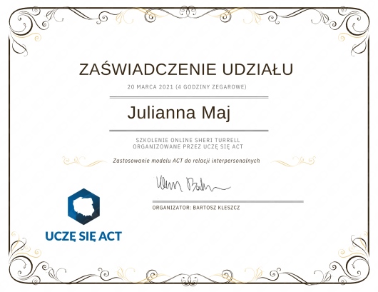 Bardzo ważnym jest dla mnie kierowanie się kodeksem etycznym oraz praktyką opartą na dowodach naukowych. Wiedzę poszerzam i aktualizuję poprzez regularnie uczestnictwo w szkoleniach, konferencjach, warsztatach, ale przede wszystkim podczas kontaktu z drugim człowiekiem. Ważnym doświadczeniem osobistym był dla mnie 11 tygodniowy kurs self practice / self reflection w paradygmacie akceptacji i zaangażowania prowadzony przez Instytut Terapii Poznawczo-Behawioralnej. Swoją pracę poddaję regularnej superwizji.