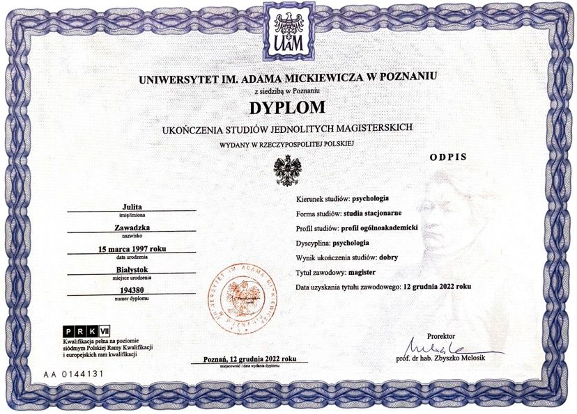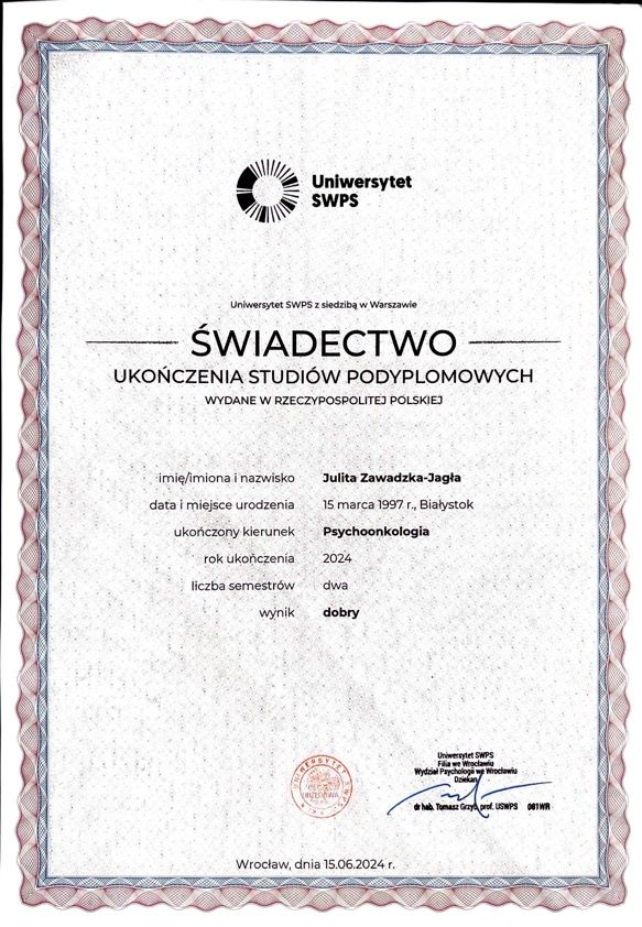 Jestem absolwentką studiów magisterskich z psychologii na Uniwersytecie im. Adama Mickiewicza w Poznaniu, gdzie ukończyłam specjalności z psychologii klinicznej – psychoterapii zaburzeń psychicznych oraz seksuologii klinicznej. Ukończyłam również studia podyplomowe z psychoonkologii na Uniwersytecie SWPS we Wrocławiu. Obecnie jestem w trakcie czteroletniej Szkoły Psychoterapii Poznawczo-Behawioralnej Uniwersytetu SWPS w Poznaniu, prowadzonej pod kierownictwem dr Agnieszki Popiel i dr Ewy Pragłowskiej. Doświadczenie zdobywałam pracując na Oddziale Onkologii Klinicznej i Radioterapii w Centrum Medycznym HCP w Poznaniu oraz na Oddziale Dziennym Rehabilitacji Psychiatrycznej w Szpitalu Wojewódzkim w Poznaniu.