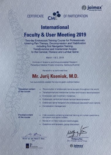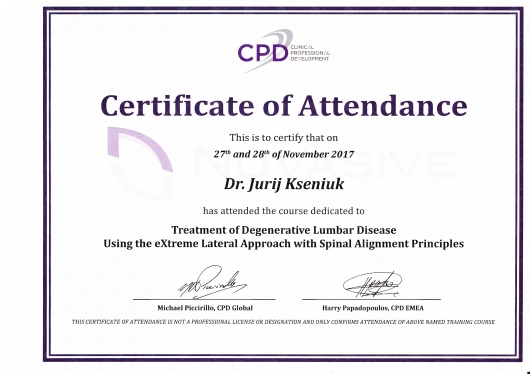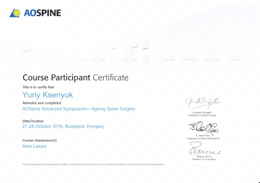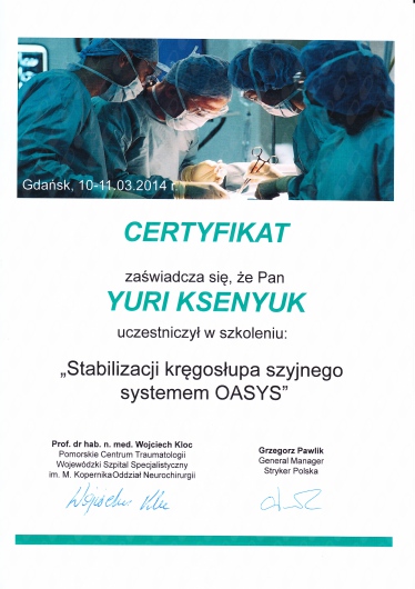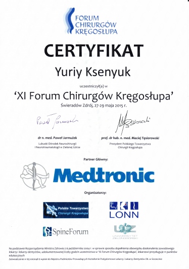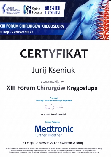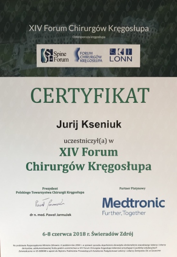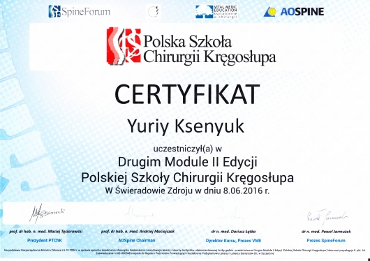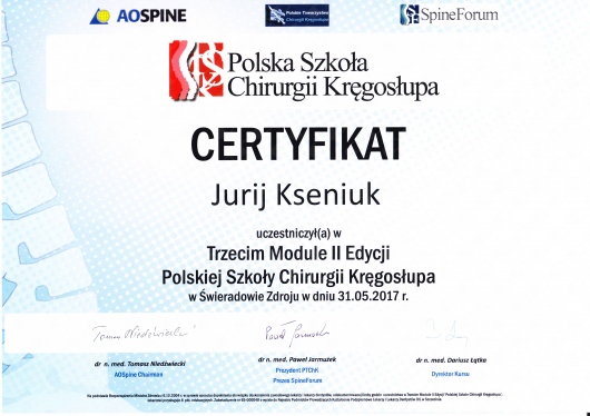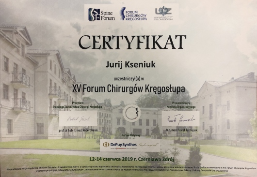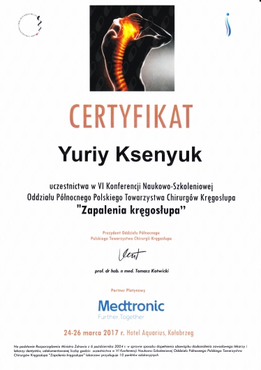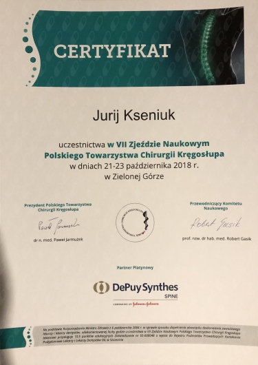 Uczestnik licznych krajowych i zagranicznych kursów i kongresów dotyczących tematyki chirurgii kręgosłupa, takich jak AO Spine, Aesculap Academy, Polskiej Szkoły chirurgii kręgosłupa, Forum Chirurgów kręgosłupa.