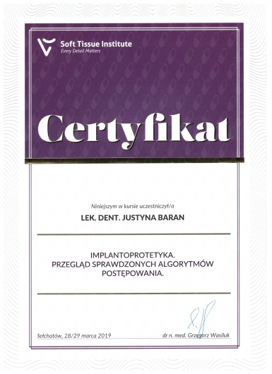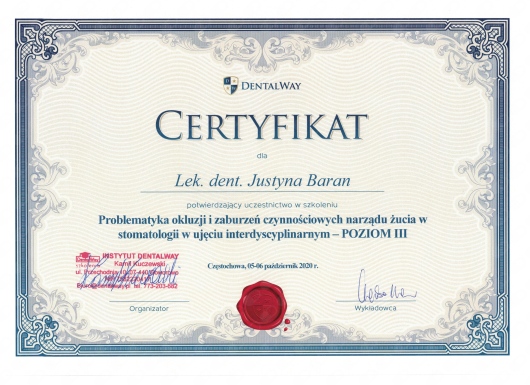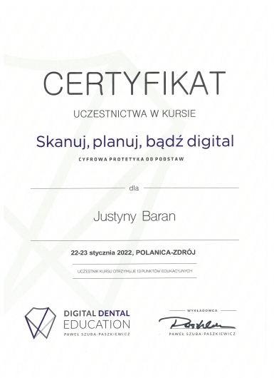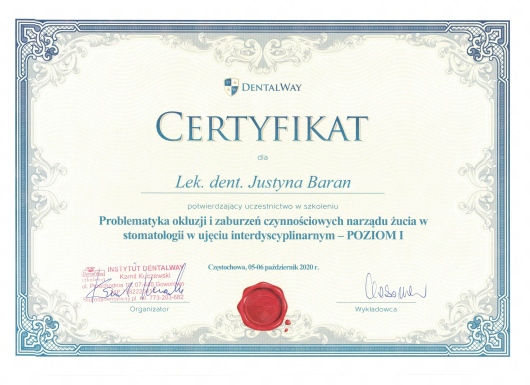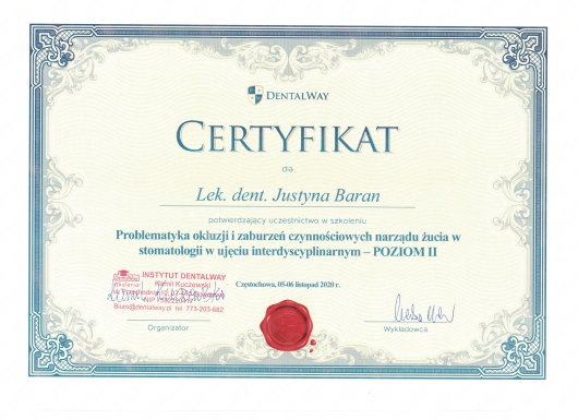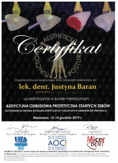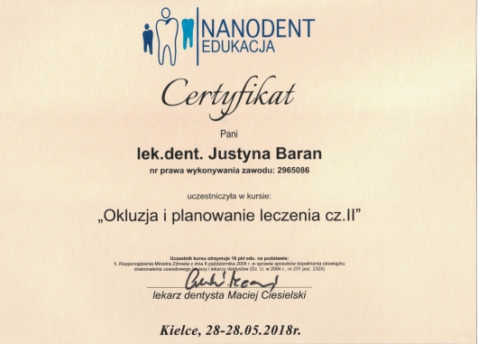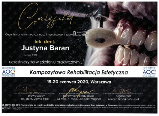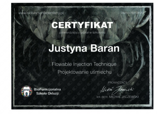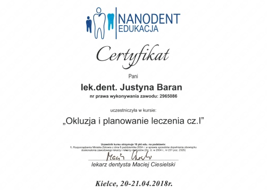 Jaki jest zakres porad oferowanych przez Justyna Baran?Justyna Baran to stomatolog, protetyk stomatologiczny. Na podstawie swojego doświadczenia i wykształcenia Justyna Baran oferuje usługi takie jak: konsultacja protetyczna, korona na tlenku cyrkonu, korona porcelanowa na metalu, korona na implancie, korona pełnoceramiczna, licówka porcelanowa, licówka kompozytowa, uzupełnienia typu inlay, onlay, bonding, szyna relaksacyjna.