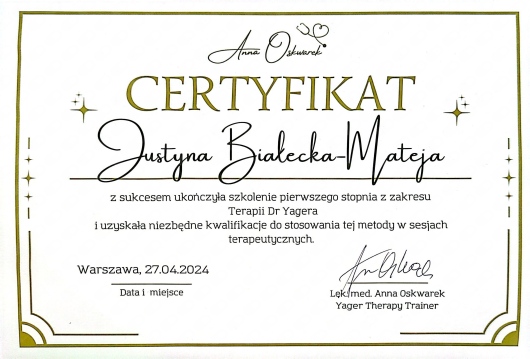 Pracuje w nurcie integratywnym, łącząc podejście psychodynamiczne, systemowe, ericksonowskie oraz poznawcze, co pozwala mi dobierać metody pracy indywidualnie do potrzeb pacjenta. Pracuje również metodą dr Yagera.