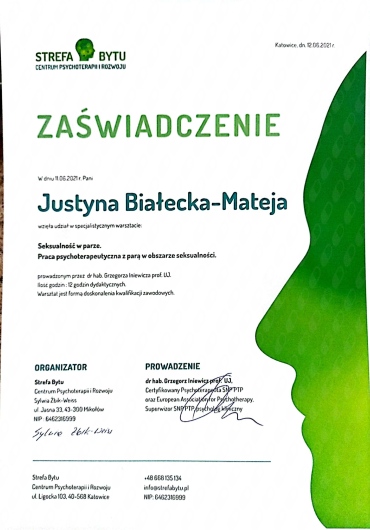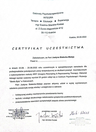 Pracuję zgodnie z zasadami etyki zawodu psychologa i psychoterapeuty. Jestem pod stałą superwizją.