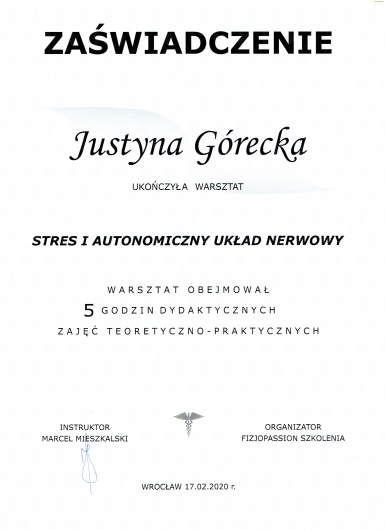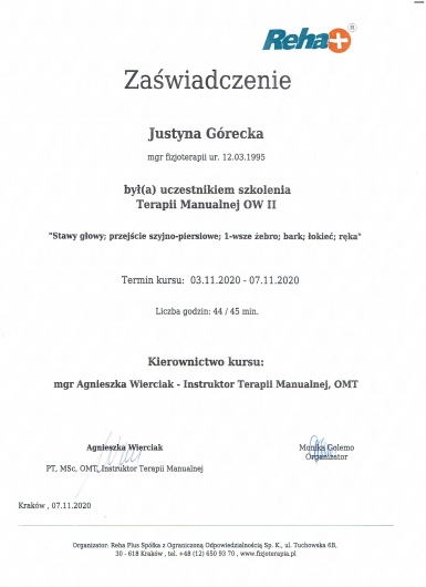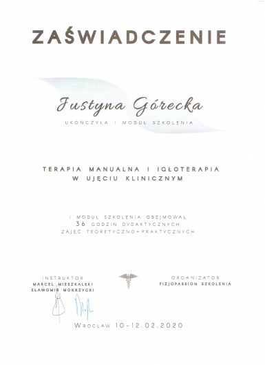 Ukończyłam kurs Terapii Manualnej i Igłoterapii w ujęciu klinicznym co pozwala mi pracować z pacjentem bólowym, ortopedycznym, a także ze sportowcami. Skutecznie radzę sobie z bólami kręgosłupa oraz dysfunkcjami stawów obwodowych. Terapię manualną uzupełniam technikami masażu tkanek głębokich, masażu poprzecznego, pracą na powięzi i terapią punktów spustowych. Techniki te pozwalają mi pokonać spięte mięśnie oraz pracować z blizną. W swojej pracy korzystam również z Kinesiotapingu, który pomaga w walce z obrzękami i urazami, jest świetnym uzupełnieniem terapii oraz pozwala utrzymać efekty leczenia do następnego spotkania. Wykorzystuję również terapię wisceralną, o której słyszy się coraz częściej w świecie fizjoterapii. Narządy wewnętrzne mają silny wpływ na stan zdrowia kręgosłupa, miednicy, żeber, obręczy barkowej oraz mięśni i powięzi. Terapia ta pozwala mi holistycznie podejść do pacjenta.