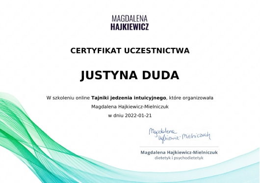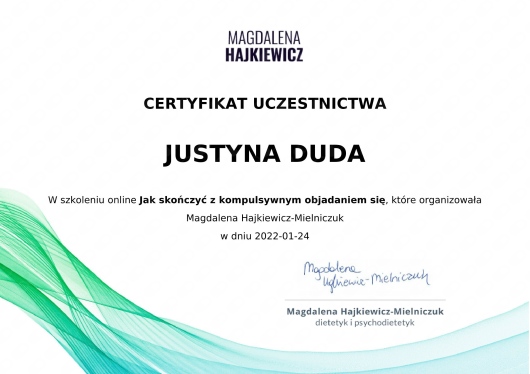 Ukończyłam studia magisterskie na kierunku dietetyka na Warszawskim Uniwersytecie Medycznym, broniąc tytuł dietetyka klinicznego. Aktualnie zdobywam wiedzę na studiach podyplomowych z psychodietetyki. Uczestniczyłam w szkoleniach na temat jedzenia intuicyjnego oraz kompulsywnego objadania się.