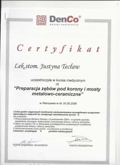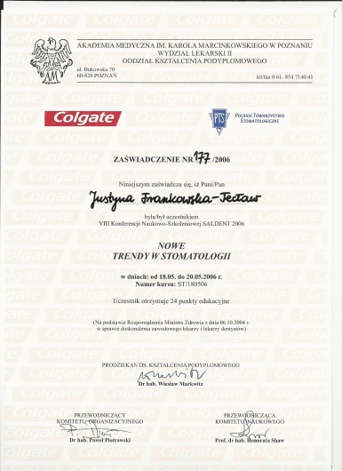 Jaki jest zakres porad oferowanych przez Justyna Frankowska-Tecław?Justyna Frankowska-Tecław to stomatolog, stomatolog dziecięcy, ortodonta. Na podstawie swojego doświadczenia i wykształcenia Justyna Frankowska-Tecław oferuje usługi takie jak: Stomatologia zachowawcza, leczenie stomatologiczne pod mikroskopem, chirurgia stomatologiczna, badania stomatologiczne, konsultacja protetyczna, Konsultacja stomatologiczna (pierwsza wizyta), Aktywacja aparatu ortodontycznego, konsultacja ortodontyczna, konsultacja endodontyczna, aparat samoligaturujący Damon.