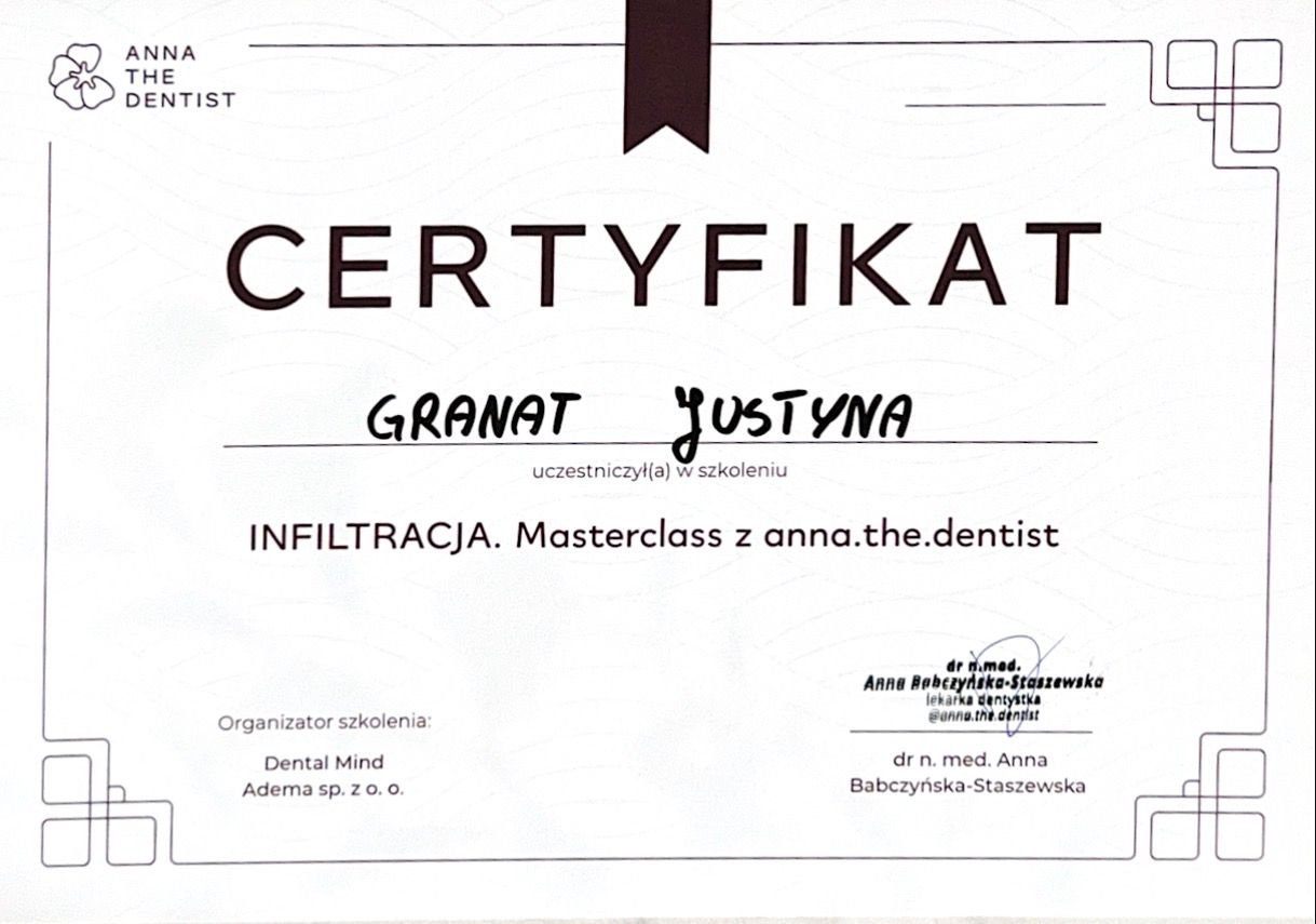 Jaki jest zakres porad oferowanych przez Justyna Granat?Justyna Granat to higienistka/higienista stomatologiczny. Na podstawie swojego doświadczenia i wykształcenia Justyna Granat oferuje usługi takie jak: higienizacja, scaling, piaskowanie, fluoryzacja zębów, lakierowanie zębów, nakładkowe wybielanie zębów, wybielanie zębów lampą, trening higieny z instruktażem, leczenie nadwrażliwości zębów, profilaktyka próchnicy.