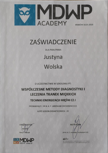 • 16.03.2018 – kurs – moduł 1 - Techniki Energizacji Mięśni część I - prowadzący dr n. k. f. Jarosław Ciechomski D. O