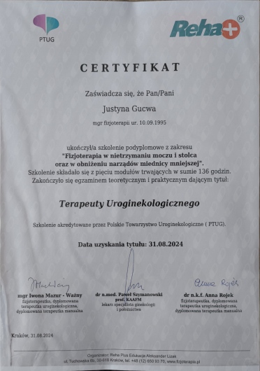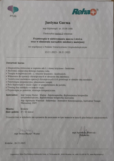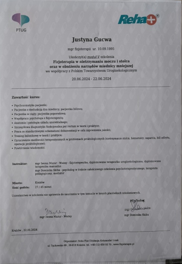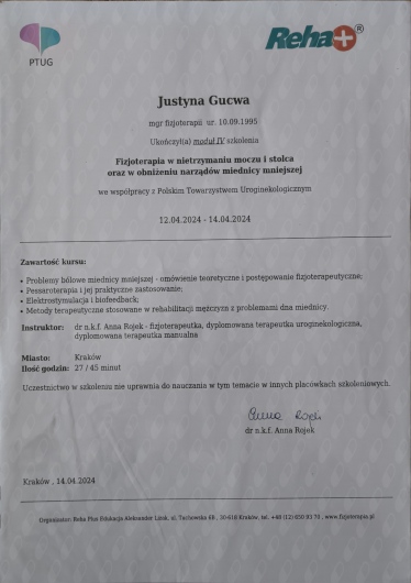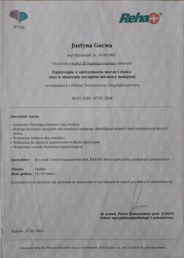 ◦ Fizjoterapia w nietrzymaniu moczu i stolca oraz w obniżeniu narządów miednicy mniejszej – RehaPlus w Krakowie - Moduł VI (egzaminacyjny) – 31.08.2024